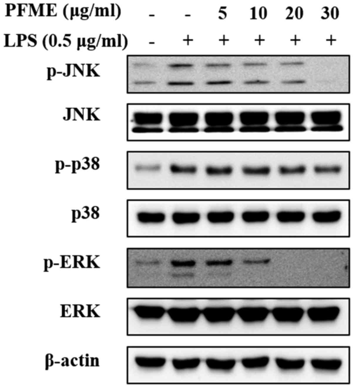 MAPKs, including p38, ERK and JNK, are a syndicate of signalling molecules that likely have an important function in inflammatory mechanisms (36). Zhang et al (37) suggested that LPSs induced MAPK cascades and the pathways leading to activation of NF-κB p65. Additionally, MAPKs are complicated by the expression of iNOS in the LPS-induced signalling pathway (38). In this study, LPS induced the phosphorylation of MAPKs. The treatment with PFME significantly inhibited the phosphorylation of LPS-induced ERK, p38 and JNK at 1 h. Consequently, these results suggest that ERK, p38 and JNK were complicated in the inhibition by PFME of LPS-stimulated NF-κB p65 binding in RAW264.7 macrophage cells. In this study, the treatment with PFME blocked the activation of ERK, p38 and JNK, which suggested that PFME suppressed LPS-induced NF-κB translocation by inhibiting the activation of these intracellular signalling cascades, leading to decreased protein levels of iNOS and COX-2 (Fig. 4).