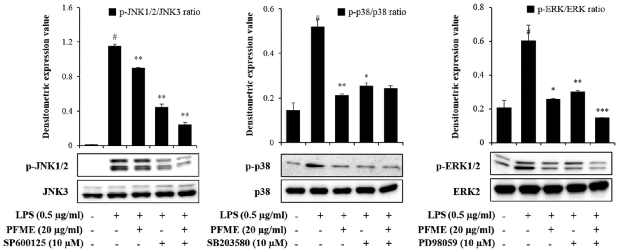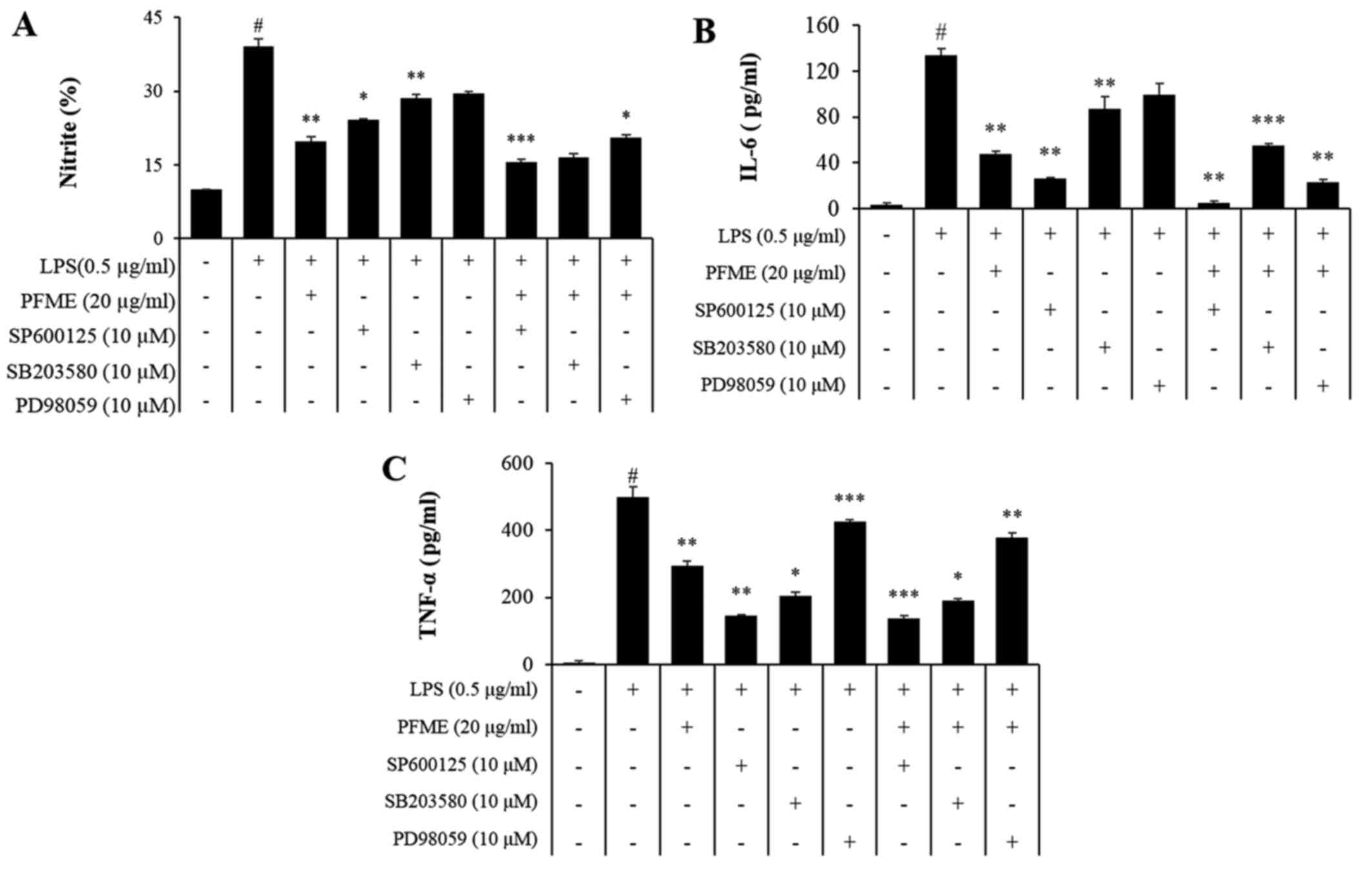 To investigate the molecular mechanism of inflammatory mediator inhibition by PFME and MAPK inhibitors in LPS-stimulated RAW264.7 cells, we studied the inhibition of the phosphorylation of JNK, p38 and ERK1/2. In cells treated with LPS alone, phosphorylation of JNK, p38 and ERK1/2 increased. However, PFME, SP600125 (JNK), SB203580 (p38), and PD98059 (ERK) treatment decreased levels of phosphorylated JNK, p38 and ERK1/2 in LPS-stimulated RAW264.7 cells (Fig. 4). We further investigated the effect of the PFME, SP600125, SB203580, and PD98059 on the inhibition of the NO assay and ELISA (IL-6 and TNF-α) (Fig. 5). These results suggested that suppression of phosphorylation of JNK, p38 and ERK1/2 may be involved in the inhibitory effect of PFME, SP600125, SB203580 and PD98059 on LPS-stimulated inflammatory mediator activation in RAW264.7 cells.