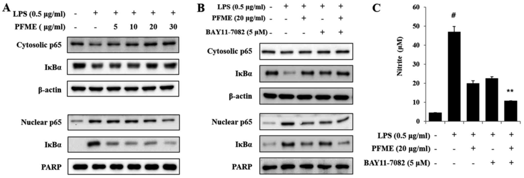 The levels of IκBα, a molecular marker in the NF-κB mechanism, were examined by immunoblot analysis. As shown in Fig. 6A, the basal level of IκBα and p65 in resting cells was high, but LPS treatment led to reduction in the translocation of p65 and IκBα degradation through the ubiq-uitin-proteasome pathway, with decreases in levels of p65 and IκBα. IκBα sequestered NF-κB in unstimulated RAW264.7 cells, but in LPS-induced cells, degradation of IκBα allowed NF-κB to translocate to the nucleus, with subsequent activation of gene expression resulting from the interaction of NF-κB and the corresponding cis-acting element. Therefore, we examined the levels of p65, the major subunit of NF-κB, in nuclear and cytoplasmic fractions, using PARP as a nuclear loading control. In this study, the inhibitor of cytokine-induced IκBα phosphorylation was BAY11-7082 (IC50, 10 μM), which was used to inhibit the NF-κB pathway as an irreversible inhibitor of IκBα phosphorylation that increases stabilization of IκBα and specifically blocks NF-κB signalling. As shown in Fig. 6B, the NF-κB p65 subunit decreased in the cytoplasm and increased in nuclear extracts after treatment with LPS. Treatment with PFME and BAY11-7082 reversed these trends in a concentration-dependent manner. We further investigated the effect of PFME and BAY11-7082 on the inhibition of NO. The LPS-stimulated translocation of the NF-κB p65 subunit from the cytosol to the nucleus in RAW264.7 cells (Fig. 6C) was inhibited by PFME. The NF-κB p65 and IκBα protein levels were significantly correlated with the reduced nuclear accumulations. Thus, we suggest that the PFME inhibited the translocation of the NF-κB p65 subunit and IκBα via the regulation of a signal transduction mechanism related to NF-κB activation.