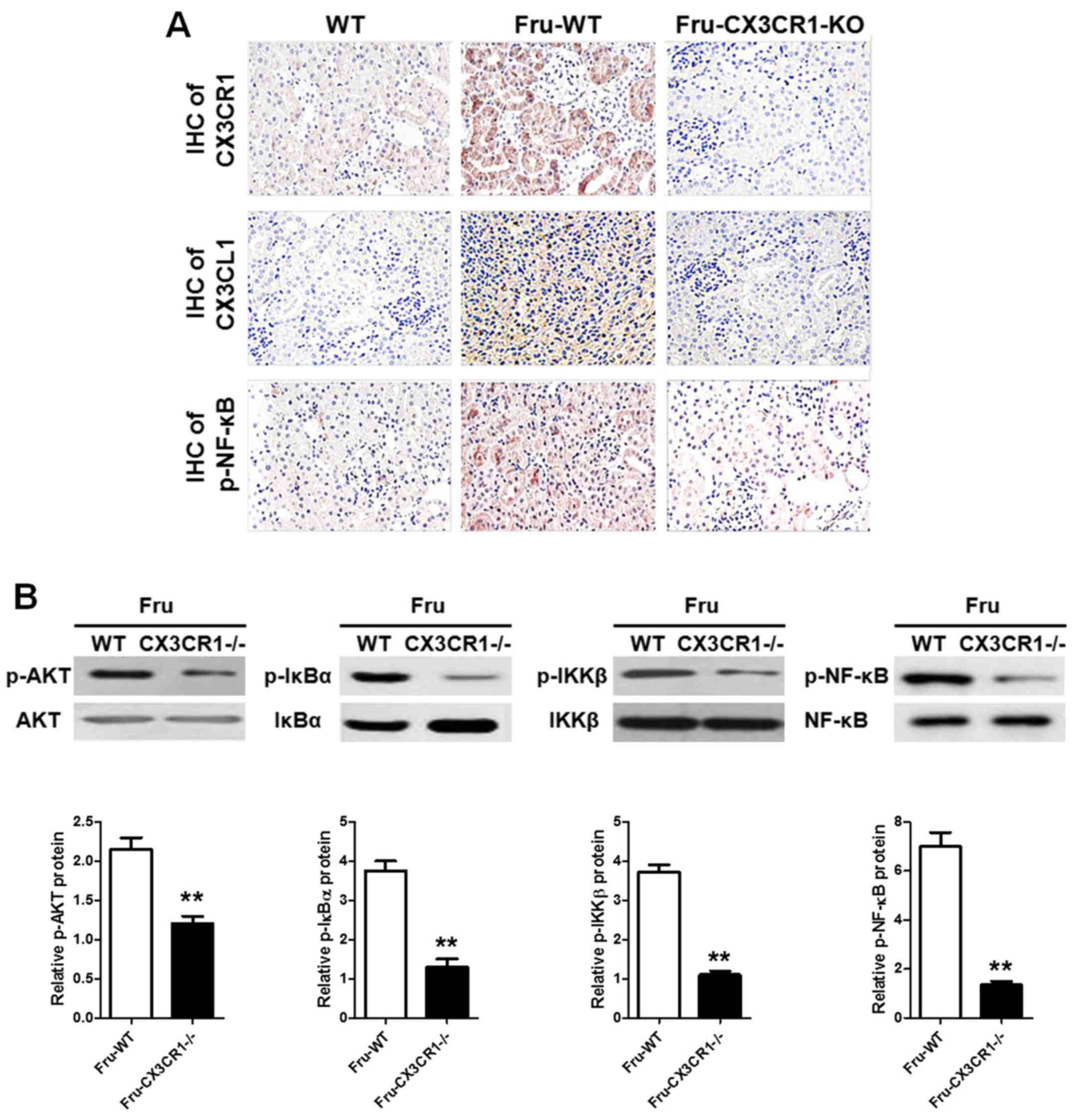 To study the possible role of CX3CL1/CX3CR1 axis in fructose-induced kidney injury of mice, we used CX3CR1-knock out mice as model to investigate the effects of crosstalk of CX3CL1-CX3CR1 axis and NF-κB pathways. IHC analysis of IκB of fructose administration showed that IκB was involved in the development of renal injury. Compared with WT group, the CX3CR1−/− mice have a lower IκB activation when challenged with fructose. As the inducer of CX3CR1, we tested the CX3CL1 expression between WT and CX3CR1−/− mice by IHC. The results indicated that CX3CR1 knockout directly impacts the expression of CX3CL1. The AKT signaling pathway may directly or indirectly associate with fructose-induced kidney injury. In knockout mice, the p-AKT expression was determined to be involved in the process of injury. The data indicated AKT as an important upstream of CX3CL1-CX3CR1 axis may impact CX3CL1-mediated inflammatory responses.