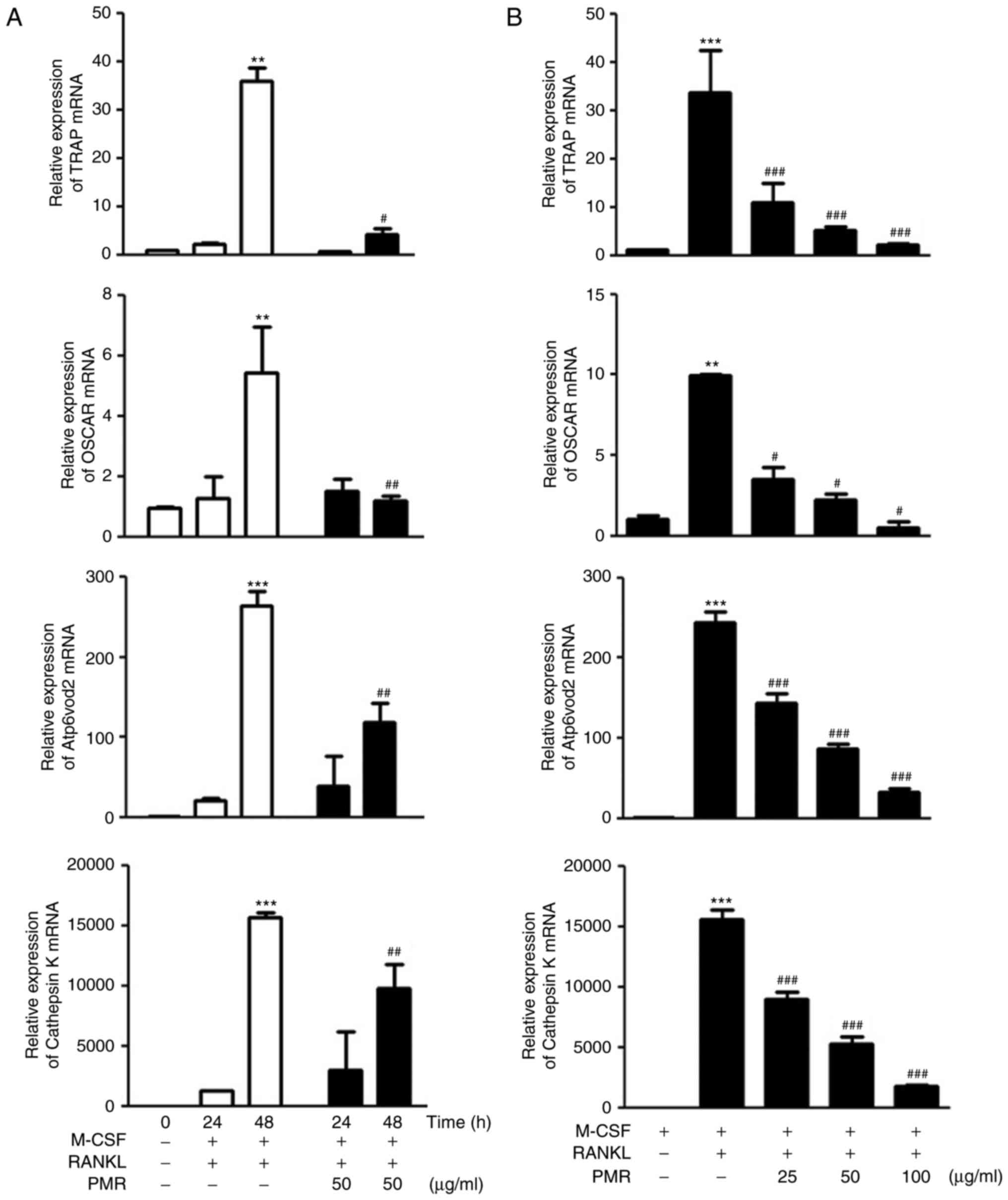K. NFATc1 induces the expression of various osteoclast-specific genes, including TRAP, OSCAR, ATP6v0d2 and Cathepsin K, during RANKL-induced osteoclast differentiation (8). To characterize the PMR-inhibitory effect on osteoclast differentiation through regulation of osteoclast-specific gene expression, the mRNA levels of genes associated with osteoclast differentiation were analyzed using RT-qPCR. PMR treatment downregulated the expression of TRAP and OSCAR (Fig. 5A), which are associated with osteoclast differentiation, as well as suppressed the expression of ATPv0d2 (Fig. 5A), which affects cell-to-cell fusion and cell migration. The expression of Cathepsin K, which is related to bone-resorbing activity, was also inhibited by PMR treatment at 48 h (Fig. 5A). Furthermore, PMR treatment significantly reduced the mRNA expression of TRAP, OSCAR, Atp6v0d2 and Cathepsin K in a dose-dependent manner (Fig. 5B). Based on these observations, PMR may have inhibited osteoclast differentiation by controlling the expression of several genes that are necessary for this process.