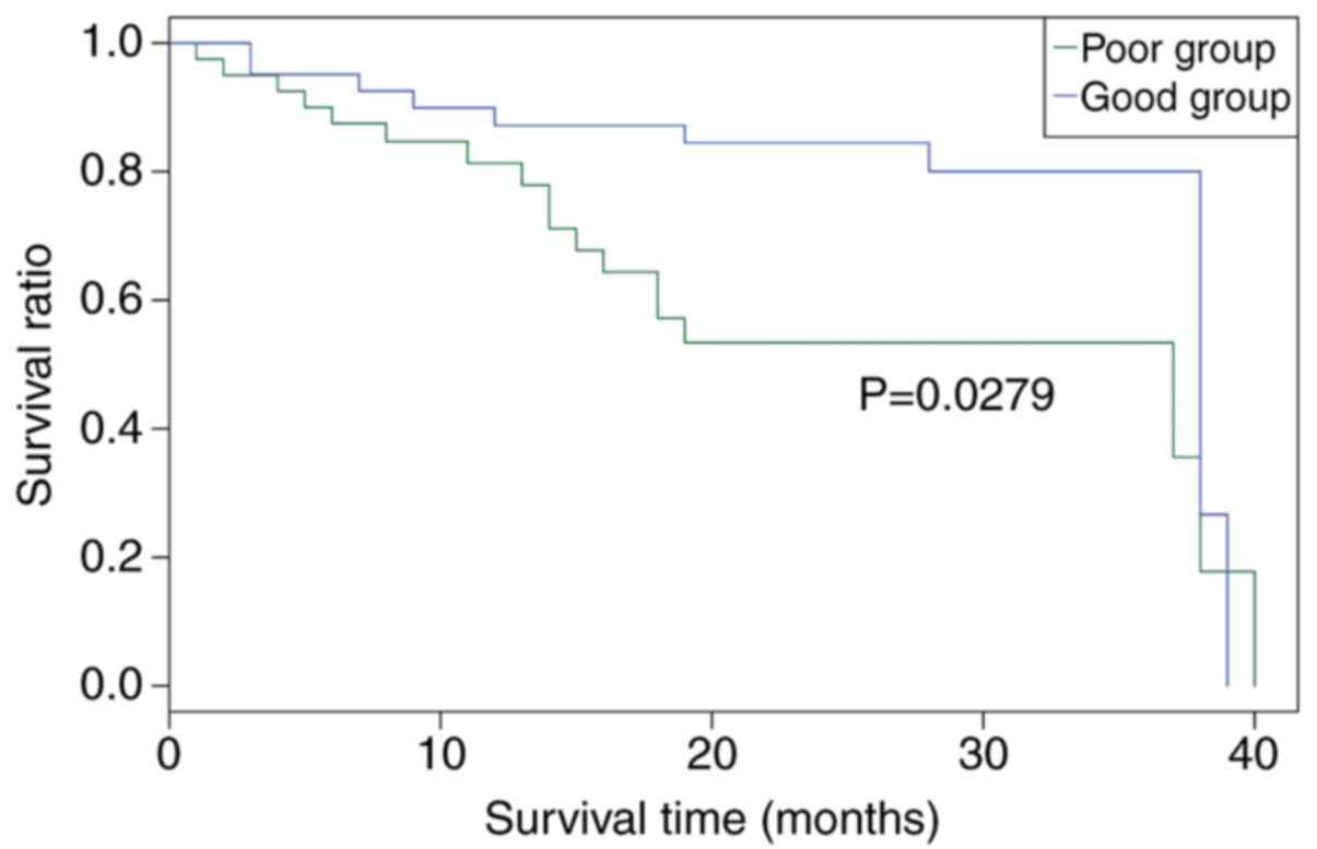 Using the survival durations of the samples, the 100 GC samples of the independent validation set were classified into good prognosis (survival ≥12 months) and poor prognosis (survival <12 months) groups using the MLP classifier. As shown in Fig. 10, the survival rate of patients was higher in the good outcome group, compared with that in the poor outcome group (P=0.0279). This finding confirmed the performance of the MLP classifier in predicting GC prognosis.