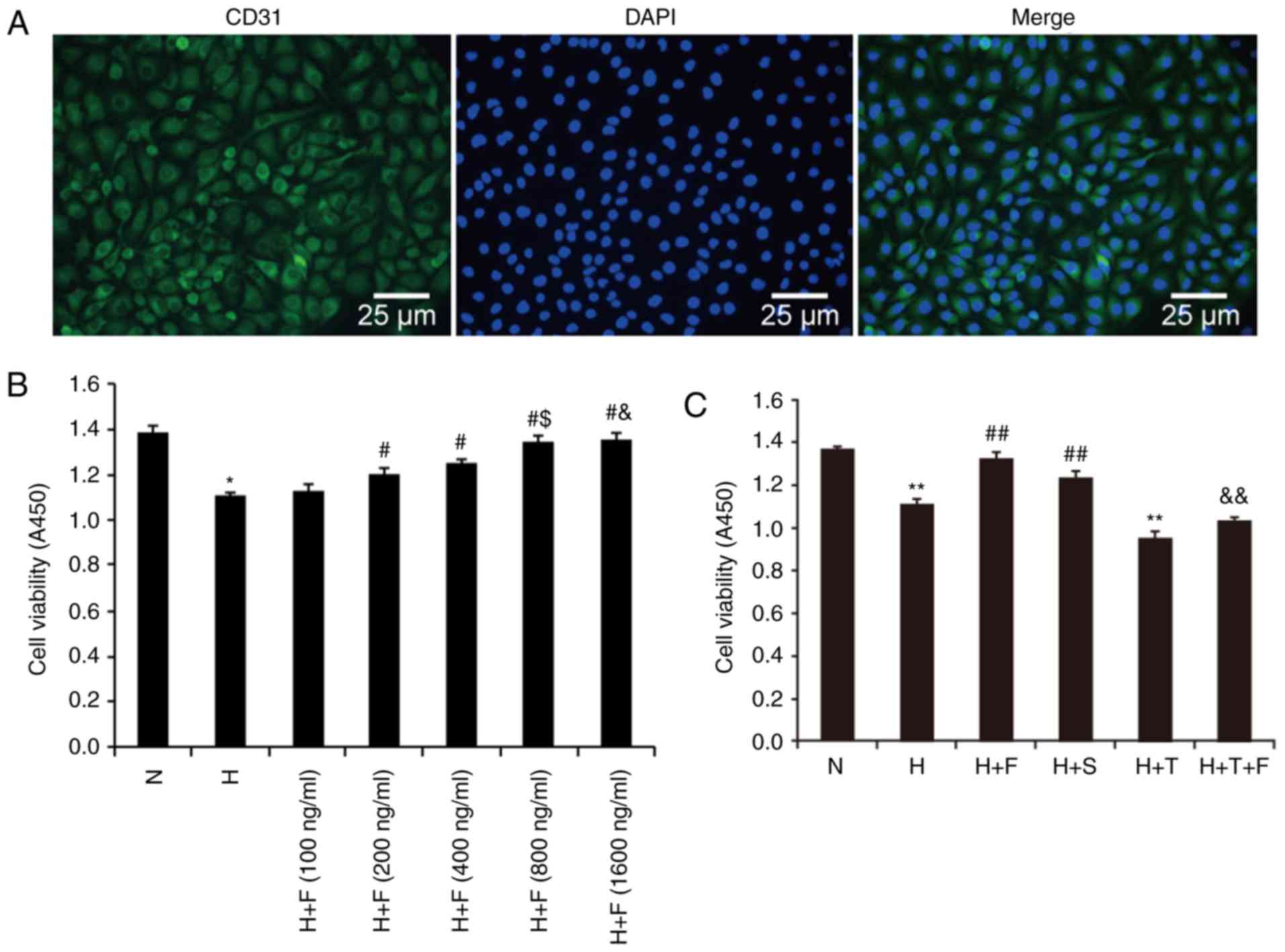 HPAECs (cat. no. 3100) were purchased from ScienCell Research Laboratories, Inc., and used as previously described (19). The HPAECs were cultured in ECM, supplemented with 5% FBS, 1% ECGS, 100 U/ml penicillin and 100 µg/ml streptomycin. The medium was changed every 2 days. When the cells reached 80-90% confluence, they were washed with PBS and treated with 0.05% trypsin-EDTA for passaging. The cells were identified through microscopy and by positive staining for CD31 (Fig. 1A). For experimental use, HPAECs from passages 3-5 were sub cultured and randomly divided into 6 groups: Normoxia group (N); hypoxia group (H); hypoxia+FGF21 group (H+F); hypoxia+salubrinal (ERS inhibitor; 20 µM) group (H+S), with the concentrations used determined from a previous study (20); hypoxia+tunicamycin (ERS agonist; 2.5 ng/ml) group (H+T) with the concentrations used determined from a previous study (21); and hypoxia+tunicamycin+FGF21 group (H+T+F). The H+F group was subdivided into 5 groups with different concentrations of FGF21, as follows: H+F (100 ng/ml), H+F (200 ng/ml), H+F (400 ng/ml), H+F (800 ng/ml) and H+F (1,600 ng/ml), to obtain the optimum concentration of FGF21. Hypoxia-treated HPAECs were treated as aforementioned for 24 h. All hypoxia groups were kept for 24 h in the hypoxia incubator at 37°C with 5% CO2, 5% O2 and 90% N2, with these conditions based on the results of previous studies (22,23), whereas the normoxia group was maintained in a normal incubator at 37°C with 21% O2, 5% CO2 and 74% N2.