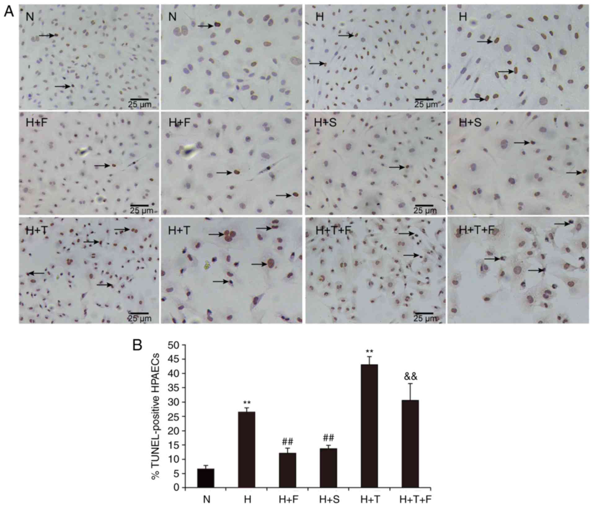 The effects of FGF21 on the apoptosis of HPAECs were evaluated by TUNEL assays. As illustrated in Fig. 2, the % of apoptotic HPAECs (indicated by brown-stained cell nuclei) was significantly increased in the H group compared with the N group (P<0.01). FGF21 or salubrinal treatment decreased the % of apoptotic cells in the H+F and H+S groups compared with the H group (P<0.01; Fig. 2). There was a significant increase in TUNEL-positive cells in the H+T group compared with the N group (P<0.01; Fig. 2), but cotreatment with FGF21 attenuated cell apoptosis in the H+T+F group (P<0.01; Fig. 2). These findings were consistent with the protective function of FGF21 in cardiac endothelial cells (18), suggesting that FGF21 could decrease the rate of apoptosis induced by hypoxia and protect HPAECs from damage or stress.