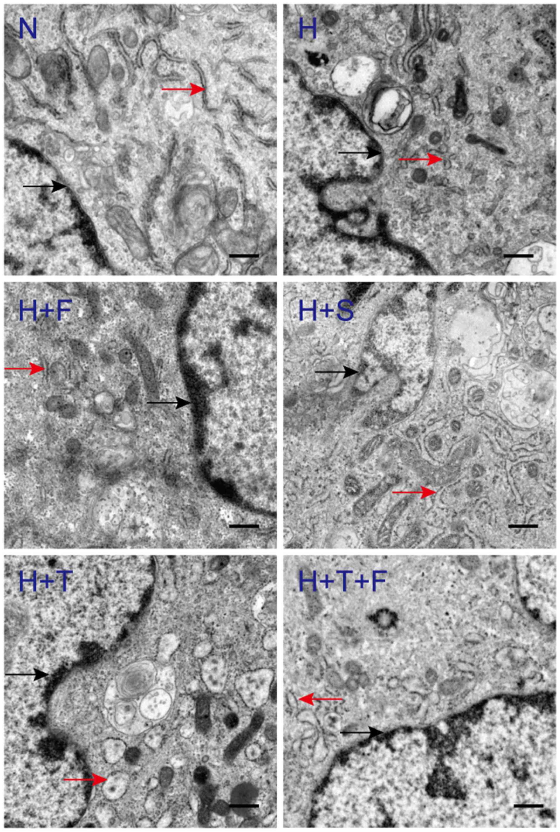 To determine whether FGF21 could protect HPAECs against hypoxia-induced ERS, the cells were examined at the ultrastructural level. Compared with the N group, the rough endoplasmic reticulum lumens of the H group and the H+T group were notably expanded, and ribosomes had become detached from the endoplasmic reticulum (Fig. 3). In the H+F and the H+S groups, the expansion of the endoplasmic reticulum lumen was reversed by FGF21 or salubrinal, similar to the normoxia group (Fig. 3). The endoplasmic reticulum lumen of the H+T group was considerably expanded, while the endoplasmic reticulum lumen of the H+T+F group was not repaired well, and mild expansion of the endoplasmic reticulum lumen continued to be observed in the H+T+F group (Fig. 3). These results indicated that FGF21 is a protective factor that could reverse the hypoxia-induced endoplasmic reticulum dilation of HPAECs.