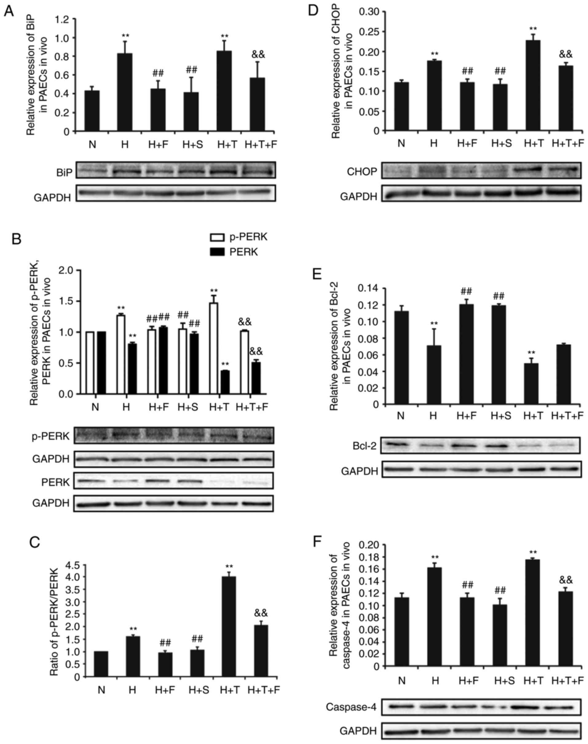 Following treatment, HPAECs were lysed with ice-cold RIPA lysis buffer containing PMSF for 30 min. Then, the lysates were centrifuged at 16,000 × g for 30 min at 4°C, and the supernatant was collected. The protein concentrations were determined using a Pierce bicinchoninic acid protein assay kit. Equal amounts of protein (20 µg) were then separated by 12% SDS-PAGE, transferred onto polyvinylidene fluoride membranes, blocked with 5% milk for 1 h at room temperature, and incubated overnight with specific primary rabbit antibodies against BiP (dilution, 1:1,000; 3183), PERK (dilution, 1:1,000; 3192), p-PERK (dilution, 1:100; orb6693), Bcl-2 (dilution, 1:1,000; 2870), caspase-4 (dilution, 1:1,000; ab22687) and GAPDH (dilution, 1:1,000; 5174S) and a mouse antibody against CHOP (dilution, 1:1,000; 2895) at 4°C. The membranes were subsequently washed with TBS/0.1% Tween-20 (TBST) buffer and membranes that had been incubated with anti-BiP, anti-PERK, anti-p-PERK, anti-Bcl-2, anti-caspase-4 and anti-GAPDH antibodies were incubated with anti-rabbit IgG HRP-linked antibody (dilution, 1:10,000; 7074), while membranes that had been incubated with the anti-CHOP antibody were incubated with an anti-mouse IgG HRP-linked antibody (dilution, 1:10,000; 7076) for 1 h at room temperature. Super Signal West Fem to Maximum Sensitivity substrate (cat. no. 3409; Shanghai Boyun BioTech Co., Ltd., Shanghai, China) was used as the visualization reagent. GAPDH was used as an internal control. The optical density of the immune blots was quantified with Quantity one-4.6.2 software (Bio-Rad Laboratories, Inc., Hercules, CA, USA).