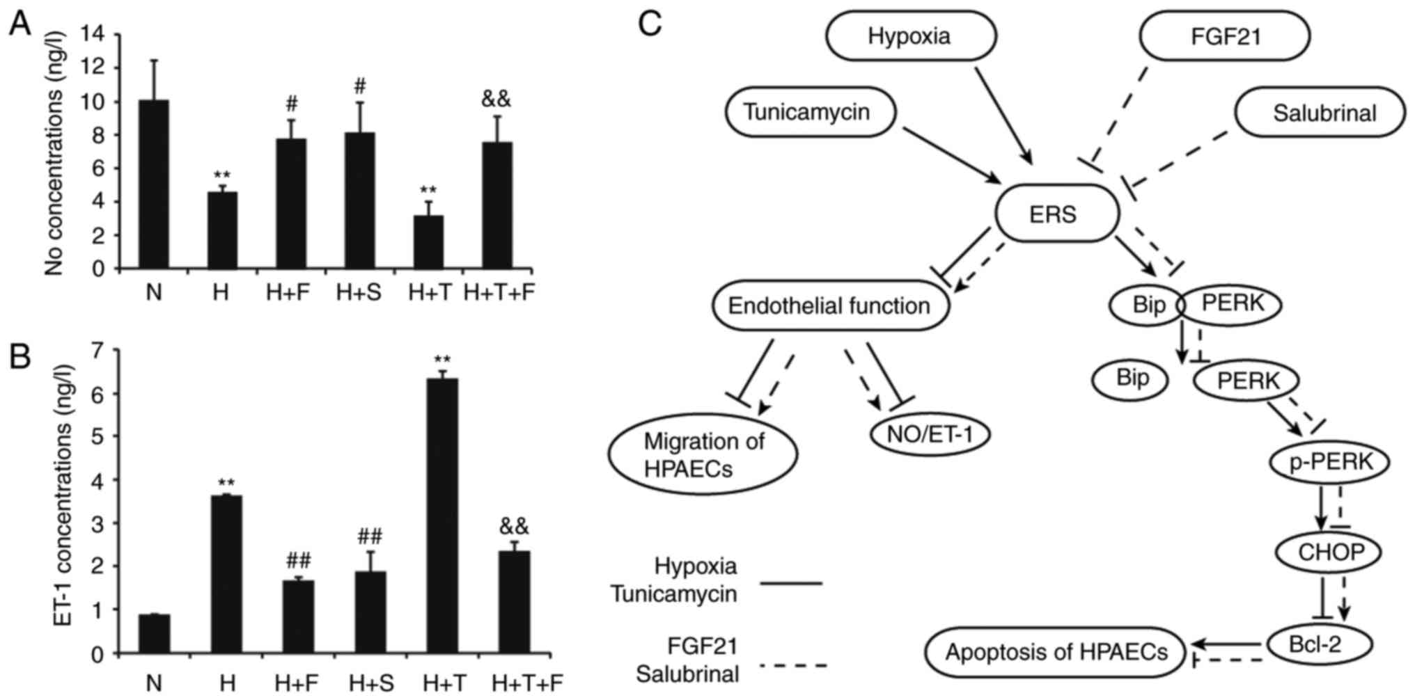 The balance between NO and ET-1 has a significant role in the development of hypoxia-induced PAH. In patients with PAH, changes in the expression of various endothelial vasoactive mediators, including NO, ET-1, prostacyclin, serotonin and thromboxane, have been increasingly recognized. Since most of these mediators affect the growth of smooth muscle cells, this may facilitate the development of pulmonary vascular hypertrophy. The present study aimed to explore the mechanism of the apoptosis and dysfunction of HPAECs under conditions of hypoxia through observing the cell morphology and function, and protein level changes. Endothelial function was investigated by assaying for the cell migration ability, and the secretion levels of NO and ET-1. Overproduction of eNOS, which stimulates the conversion of L-arginine to citrulline, producing NO (40), prevents hypoxia-induced PAH in transgenic mice (41). Several previous studies suggest that NO protects against hypoxia-induced vasoconstriction in the lungs, inhibits smooth muscle proliferation and platelet aggregation, and decreases the secretion of ET-1 (39). ET-1 expression is elevated in animal models of PH and in patients with PH (39). ET-1 receptor antagonists, such as bosentan, improve the functional status of patients and other indices of PH-related morbidity (42). The present results revealed that hypoxia reduced the secretion of NO and increased the secretion of ET-1 in HPAECs. In addition, FGF21 and the ERS inhibitor salubrinal were demonstrated to improve the secretion of NO and ET-1 in HPAECs under conditions of hypoxia.