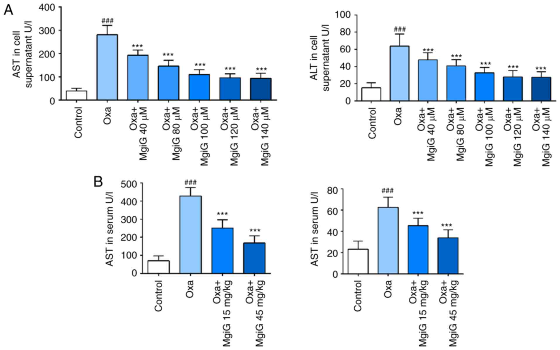 Aminotransferase levels are diagnostic markers of liver damage. LO2 cells exposed to oxaliplatin were cultured in medium supplemented with or without MgiG, and mice receiving oxaliplatin were treated with or without MgiG. AST and ALT activity in serum and cell supernatants was then measured. Following oxaliplatin challenge, both indicators significantly increased in cell supernatants (Fig. 1A). In the MgiG-treated groups, the increase in indicators was significantly attenuated (Fig. 1A). AST and ALT levels continued decreasing when the MgiG concentration was below 100 µM. AST and ALT activity in mouse serum also displayed a significant increase following oxaliplatin administration (Fig. 1B). MgiG effectively attenuated the oxaliplatin-induced changes and this effect was dose-dependent with a more significant reduction observed in the high-dose group (Fig. 1B).