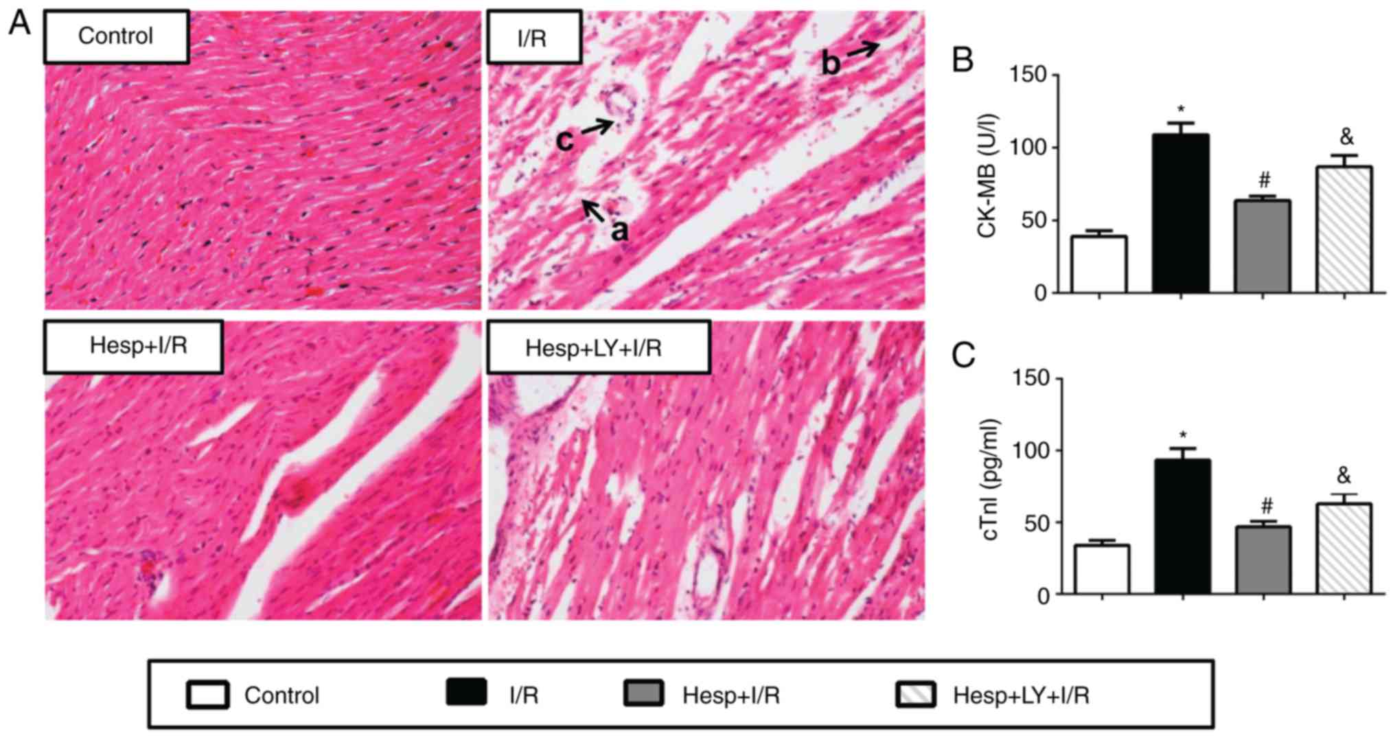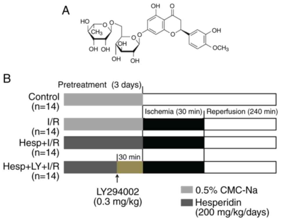 Li X, Hu X, Wang J, Xu W, Yi C, Ma R and Jiang H: Short-term hesperidin pretreatment attenuates rat myocardial ischemia/reperfusion injury by inhibiting high mobility group box 1 protein expression via the PI3K/Akt pathway. Cell Physiol Biochem. 39:1850–1862. 2016. View Article : Google Scholar : PubMed/NCBI