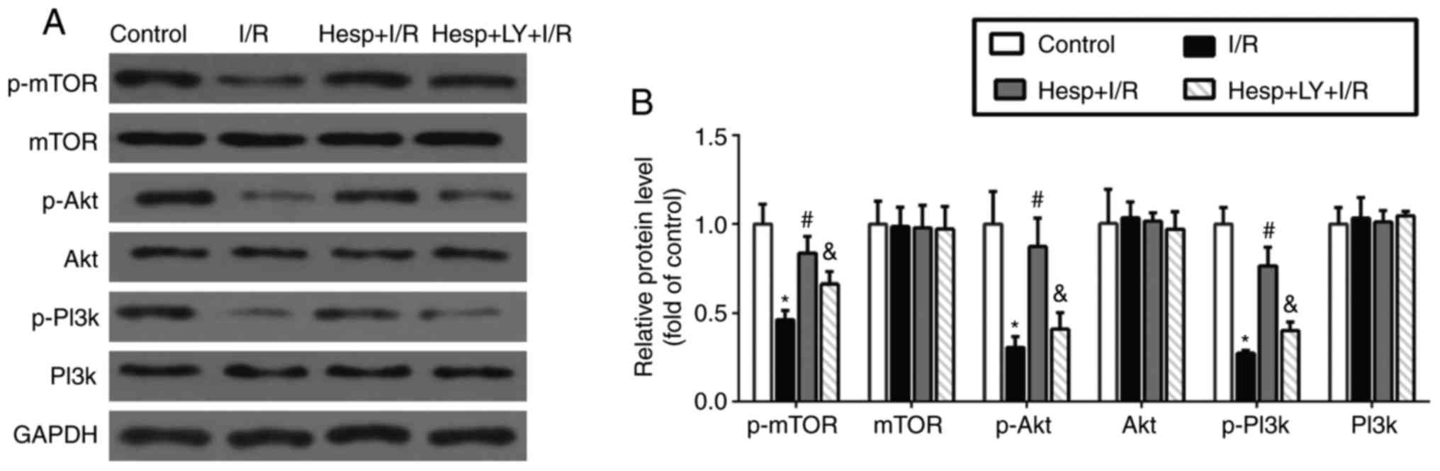 Li X, Hu X, Wang J, Xu W, Yi C, Ma R and Jiang H: Inhibition of autophagy via activation of PI3K/Akt/mTOR pathway contributes to the protection of hesperidin against myocardial ischemia/reperfusion injury. Int J Mol Med 42: 1917-1924, 2018.