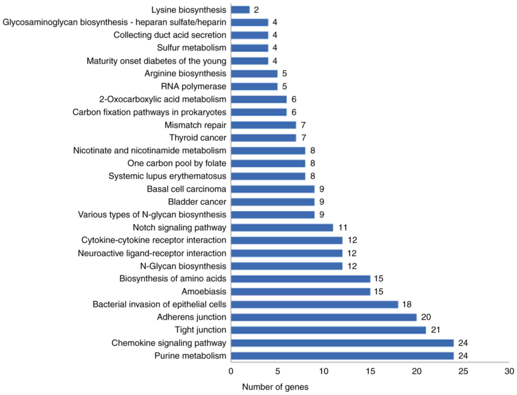 In order to obtain a list of DEGs, Gene Ontology (GO) and pathway enrichment analyses were performed. In addition, GO terms, Interpro (protein sequence analysis and classification) terms, and Kyoto Encyclopedia of Genes and Genomes (KEGG) pathways that were significantly enriched on our list of genes with altered expression (P<0.05) were identified. Additionally, the integrated pathways with statistical values were computed from our list of DEGs using a reactome pathway analysis (http://www.reactome.org/). For over-representation analysis, the number of altered genes associated with a pathway was compared between the treatment and control groups. To determine pathway perturbation, the significance of a particular gene to a pathway was considered in determining the overall impact on the pathway by examining all annotated functions/interactions of the gene.