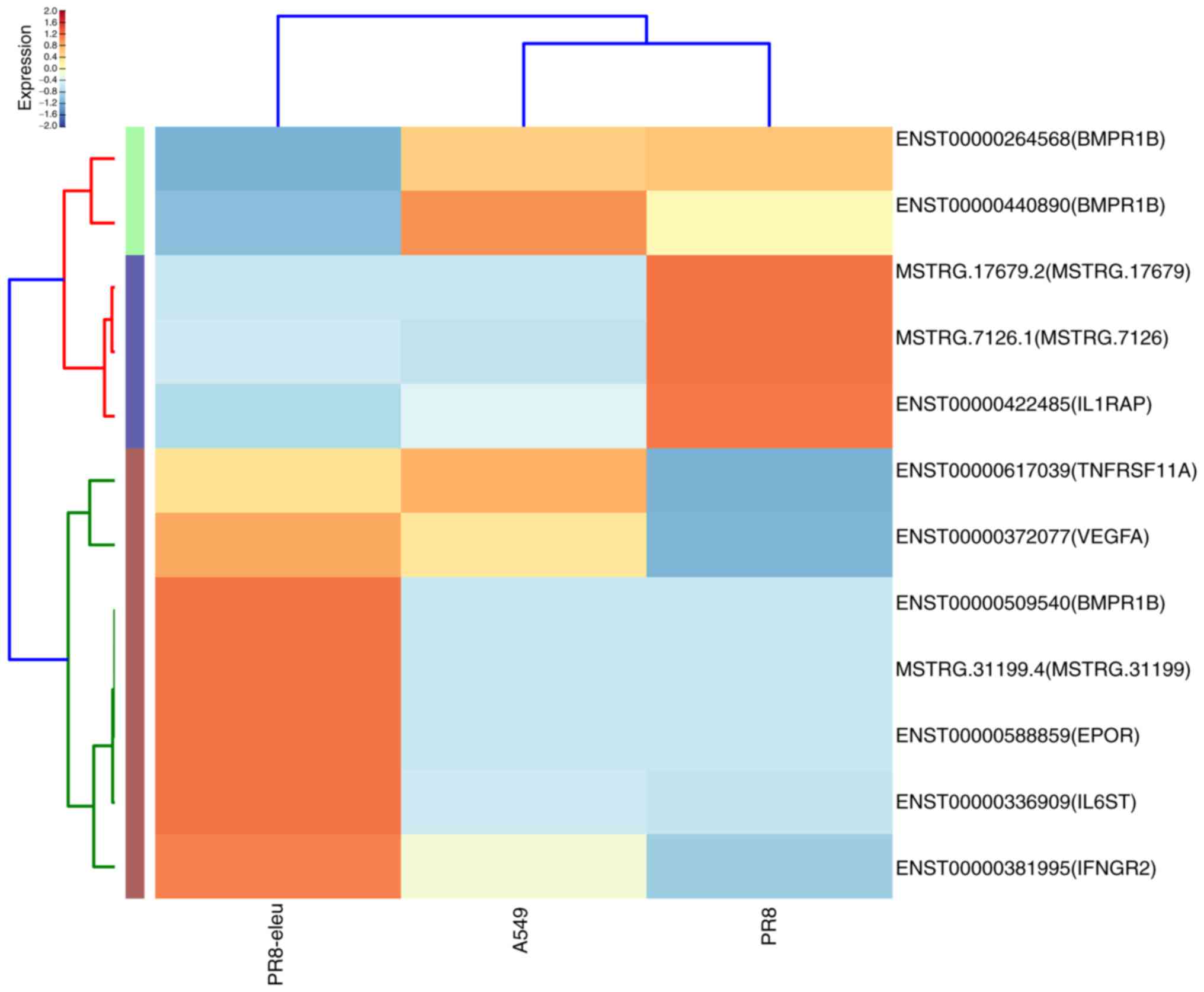 The gene lists generated for influenza A virus-infected human lung epithelial A549 cells in the absence or presence of eleutheroside B1 treatment revealed large differences in the number and the type of genes that were transcriptionally activated. To gain an improved understanding of the host cell response to influenza virus infection at 24 h, the 1,871 DEGs (958 upregulated and 913 downregulated genes) between the PR8 and the PR8 + eleu groups were characterized by performing an enrichment analysis according to biological process, cellular composition and molecular function. GO enrichment analysis indicated that numerous DEGs were involved in molecular function and biological processes, and these results are presented in Table III. The GO enrichment results revealed that eleutheroside B1 recruited molecular function and biological process genes in the host to inhibit the infection of influenza virus. KEGG pathway enrichment analysis suggested that these DEGs were associated with the immune system, glycan biosynthesis and metabolism, signaling molecules and their interaction, transcription (e.g., of the chemokine signaling pathway), various types of N-glycan biosynthesis, cytokine-cytokine receptor interaction, and RNA polymerase function, which are host-response pathways that are activated in response to influenza virus infection (Fig. 1). Twelve DEGs were enriched in cytokine-cytokine receptor interactions. Of these DEGs, bone morphogenetic protein receptor type 1B (BMPR1B), interleukin-6 signal transducer (IL6ST), interferon γ receptor 2 (IFNGR2), interleukin-1 receptor-associated protein (IL1RAP) and erythropoietin receptor (EPOR) have been reported to be involved in the host immune response to virus infections (Fig. 2). BMPR1B is a host gene, the levels of which change during the process of influenza virus infection (23), and this was expressed at a 548-fold higher level compared with the PR8 group. IFNGR2 is the upstream molecule in the interferon γ (IFN-γ) signaling pathway, which is affected by the influenza virus (24). Compared with the PR8 group, there was a 1,369-fold upregulation of the IFNGR2 gene in the PR8 + eleu group. EPOR is crucial for the phosphorylation of signal transducer and activator of transcription (STAT) 5, which acts as an important molecule in the Janus kinase (JAK)-STAT signaling pathway (22). Influenza A virus directly interferes with IFN-γ-stimulated signal transduction via this pathway, which enables the virus to inhibit IFN-γ-inducible gene expression (24). In the present study, levels of the EPOR gene were found to be upregulated by 255-fold. IL1RAP is a co-receptor of the IL-1 receptor (IL1R1) and the IL-33 receptor (ST2), and is required for signaling through both receptor complexes. The inhibition of IL1RAP is also capable of blocking IL-1 signaling, which disrupts the activation of nuclear factor (NF)-κB mediated by IL-1 and IL-33, and may inhibit influenza virus-induced pro-inflammatory reaction (25).
