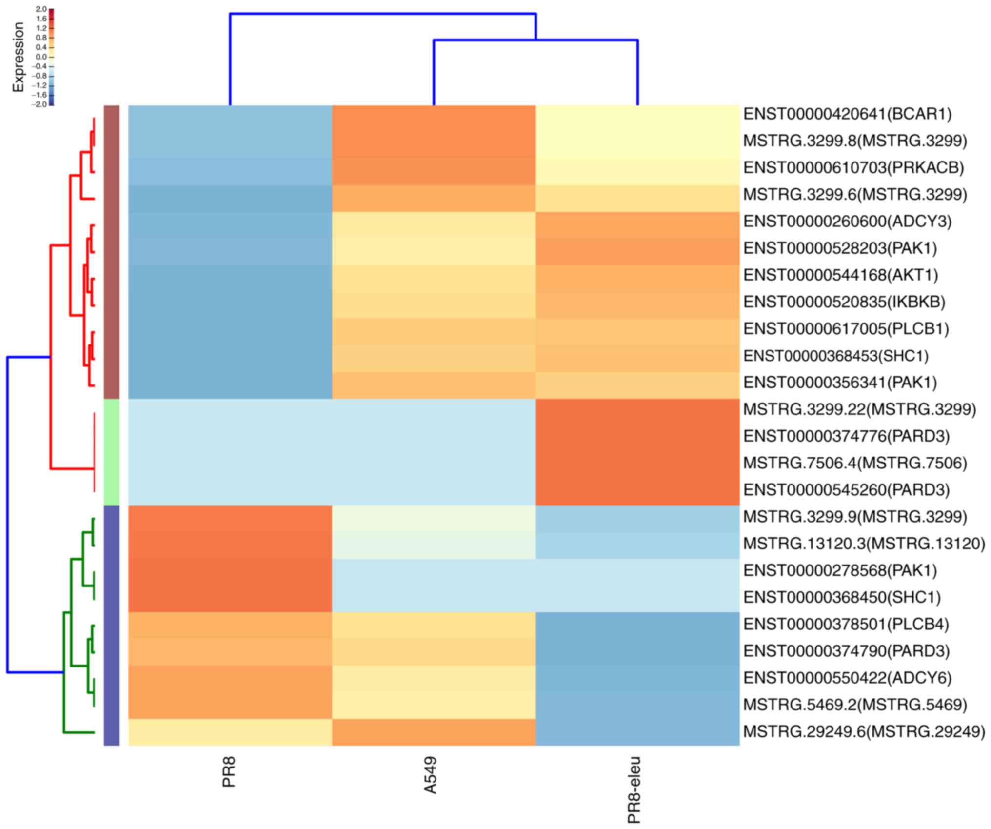 To investigate the molecular mechanism of eleutheroside B1 action against influenza A virus infection, RNA sequencing of influenza A virus-infected human lung epithelial A549 cells, in the presence or absence of eleutheroside B1 treatment, was performed using an Illumina X-ten RNA-seq sequence production system. The RNA sequences were subsequently aligned against the human gene sequences. Three different experimental groups were established: Lung epithelial A549 cells without infection (A549 group), A549 cells infected with influenza strain A/PR8/34/(H1N1) alone (PR8 group), and A549 cells both infected with A/PR8/34/(H1N1) and treated with 100 µg/ml eleutheroside B1 (PR8 + eleu group). At 24 h after the influenza virus infection, samples were harvested and subjected to library construction and RNA sequencing. An excess of 13 million raw reads for each sample were generated from the constructed RNA sequencing libraries using the Illumina X-ten RNA-seq sequence production system. After stringent data filtering, 34.75 M (97.11%; A549 group), 33.97 M (95.93%; PR8 group), or 34.79 M (95.45%; PR8 + eleu group) sequencing reads could be unambiguously mapped against the reference genome (Table II), which confirmed the high quality of the sequencing of these samples, and a satisfactory variable for subsequent analyses.