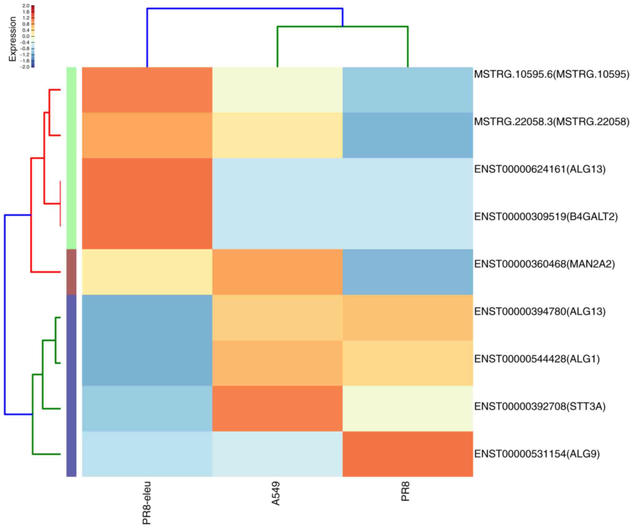 Influenza A virus infection in the lung is associated with a robust host inflammatory response and sustained elevated levels of inflammatory immune mediators (26), whereas certain natural product compounds have been demonstrated to exhibit anti-inflammatory effects (27,28). The DEG data associated with the chemokine signaling pathway (Fig. 3) confirmed our previous finding that eleutheroside B1 exhibits anti-inflammatory activity against the influenza virus (14). The DEGs identified in the N-glycan biosynthesis pathway suggest other ways in which eleutheroside B1 may work against the influenza virus. In the N-glycan biosynthesis pathway, there are only a small number of glycosyltransferases catalyzing different glycosidic linkages on different N-glycans that exert a crucial role in cellular activity (29). The synthesis of influenza virus hemagglutinins has been reported to be involved in this process (30). In the present study, 12 enriched DEGs were identified in the major N-glycan biosynthesis pathway, 9 enriched DEGs were found in various other types of N-glycan biosynthesis pathways, and 3 genes were found in other glycan degradation pathways (Fig. 4), all of which are involved in glycan biosynthesis and metabolism. These included: UDP-N-acetylglucosaminyltransferase subunit (ALG13), mannosidase α class 2A member 2 (MAN2A2), mannosidase α class 2C member 1 (MAN2C1), chitobiosyldiphosphodolichol β-mannosyltransferase (ALG1), and α-1,2-mannosyltransferase (ALG9). MAN2C1 has dual functions: One is associated with glycan catabolism, whereas the other is in apoptotic signaling, and its downregulation has been reported to delay cancer growth by inducing either mitotic arrest or apoptosis (31). MAN2C1 overexpression also results in synthesis of the non-glucosylated Man9GlcNAc2 oligosaccharide precursor, which is transferred to the protein substrates more inefficiently, thereby resulting in protein underglycosylation (32). In the present study, MAN2C1 was upregulated 9-fold following eleutheroside B1 treatment.
