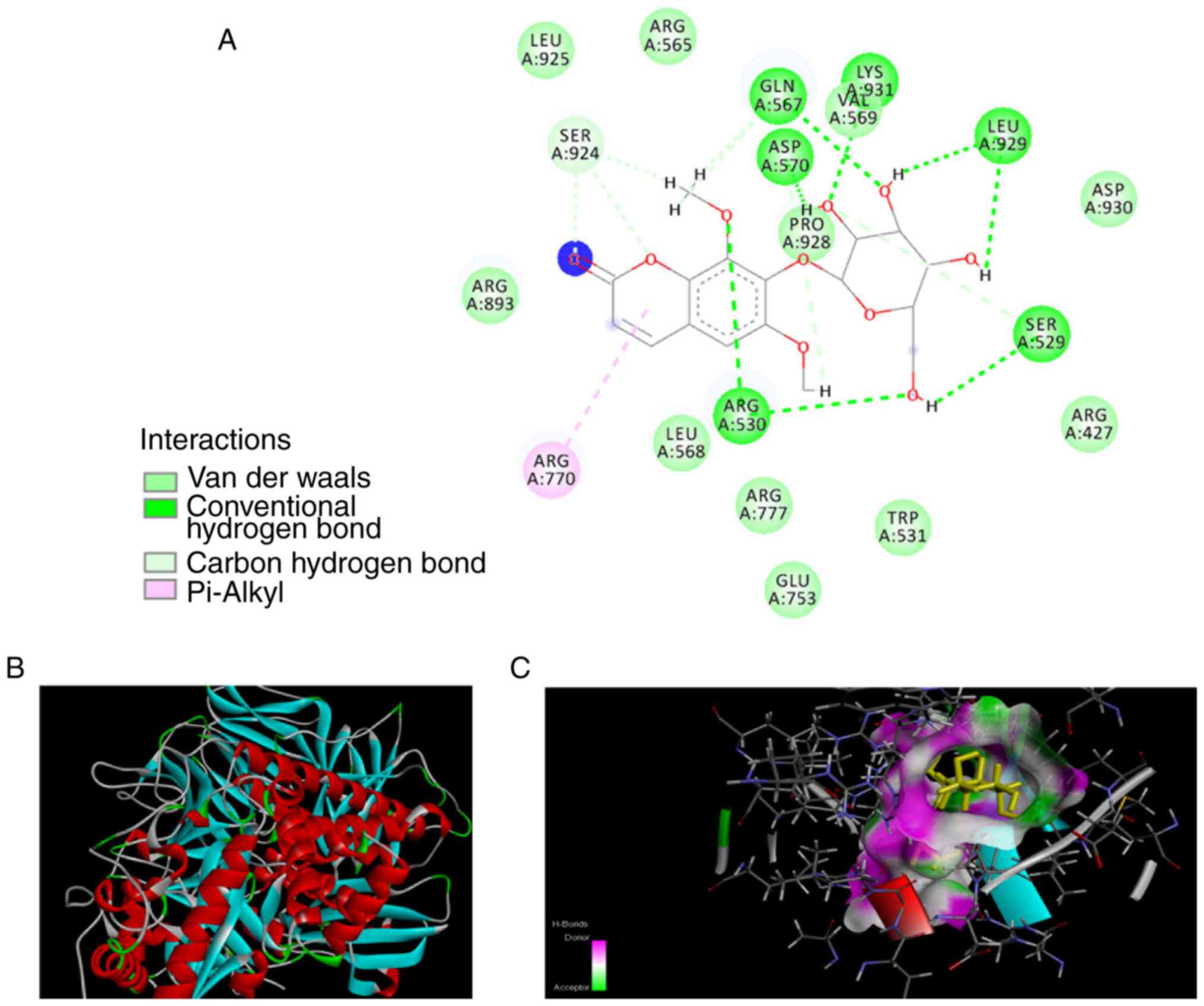 To determine its potency, the best-docked conformation of eleutheroside B1 was analyzed, and this molecular compound was found to bind to the inside of D. melanogaster MAN2A1(3BVT) and human POLR2A(3D9N), based upon the hydrogen and hydrophobic interactions. If such features are identified, it demonstrates that the compound in question may be responsible for mediating biological activities. The docked conformations of eleutheroside B1 in the D. melanogaster MAN2A1(3BVT) and human POLR2A(3D9N) structures are illustrated in Figs. 5 and 6, respectively. The interaction analysis revealed that there are 13 hydrogen bonds formed by eleutheroside B1 in the binding site of D. melanogaster MAN2A1(3BVT), and four hydrogen bonds formed by eleutheroside B1 in the binding site of human POLR2A(3D9N), together with two carbon-hydrogen bonds and two conventional hydrogen bonds. Other interactions were also investigated, including van der Waals' forces, which contact the surrounding residues in the binding site of bovine serum antigen, including Arg-893, Leu-925, Arg-565, Leu-568, Arg-777, Glu-753, Trp-531, Arg-427 and Asp-930. Inspection of the molecular interactions revealed that hydrogen bonds and van der Waals' forces were the major factors influencing the stabilities of the eleutheroside B1-MAN2A1 and the eleutheroside B1-POLR2A complexes, which are illustrated in Figs. 5 and 6, respectively.