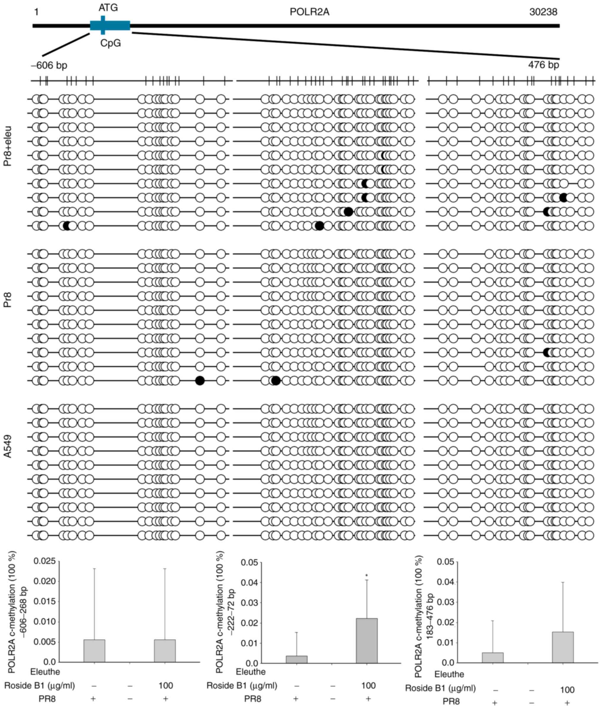 Even in the molecular docking assay, human MAN2A1 did not match precisely with eleutheroside B1; however, the possibility of their biological interaction could not be excluded. Therefore, MAN2A1 and POLR2A were selected to examine the CpG methylation levels modified by eleutheroside B1. CpG islands were identified on the POLR2A and MAN2A1 promoters by sequence analysis (http://www.urogene.org/cgi-bin/methprimer/methprimer.cgi; Fig. 7). To investigate whether eleutheroside B1 modifies DNA methylation of POLR2A and MAN2A1, bisulfite-sequencing PCR (BSP) was performed to quantitatively analyze the methylation levels of CpG sites in these genes in A549 cells incubated with or without eleutheroside B1 following infection with A/PR/8/34 (H1N1). Ten clones were selected for the analysis of each CpG site. The BSP analysis revealed that the average proportion of methylated CpGs of the POLR2A gene increased significantly (P<0.05) in A549 cells treated with eleutheroside B1 compared with the PR8 group (Fig. 7). However, no significant differences were identified for the proportion of methylated CpGs of the MAN2A1 gene between A549 cells with or without eleutheroside B1 treatment following infection with A/PR/8/34 (H1N1) (data not shown).