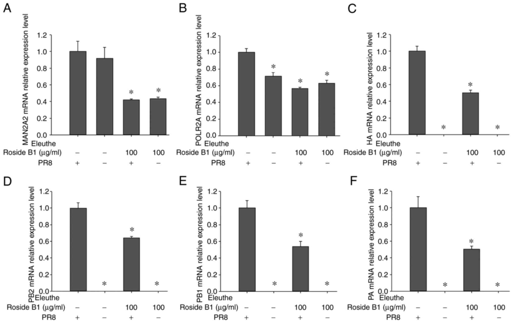 To identify genes involved in novel pathways, such as various types of N-glycan biosynthesis and RNA polymerase function, the expression levels of host genes (MAN2A2, POLR2A) were detected. In glycan biosynthesis and metabolism, MAN2A1, MAN2A2, and MAN2C1 were identified as the important targets. MAN2A1 did not display a potential interaction with eleutheroside B1; MAN2A2, however, was involved in the various types of N-glycan biosynthesis pathways, whereas MAN2C1 was involved in other glycan degradation pathways. POLR2A demonstrated a marked potential interaction with eleutheroside B1 in the present study, and significant levels of expression were observed following influenza infection in A549 cells treated with eleutheroside B1, and influenza infection of the A549 cells in the RNA sequencing studies. Therefore, MAN2A2 and POLR2A were selected for determination of their expression levels. In addition, virus genes (PA, PB1, PB2, HA) in A/PR/8 (0.1 MOI)-infected A549 cells were also subjected to mRNA expression studies. The results demonstrated that the expression of host genes (MAN2A2, POLR2A) and virus genes (PA, PB1, PB2, HA) were decreased following eleutheroside B1 treatment at a concentration of 100 µg/ml (Fig. 8). The expression levels of the influenza virus ribonucleoprotein (RNP) genes (PA, PB1, PB2) were down-regulated by eleutheroside B1, a finding which was consistent with the results of a previous study, showing that eleutheroside B1 may target the influenza virus RNP and RNA polymerases in the host (14).