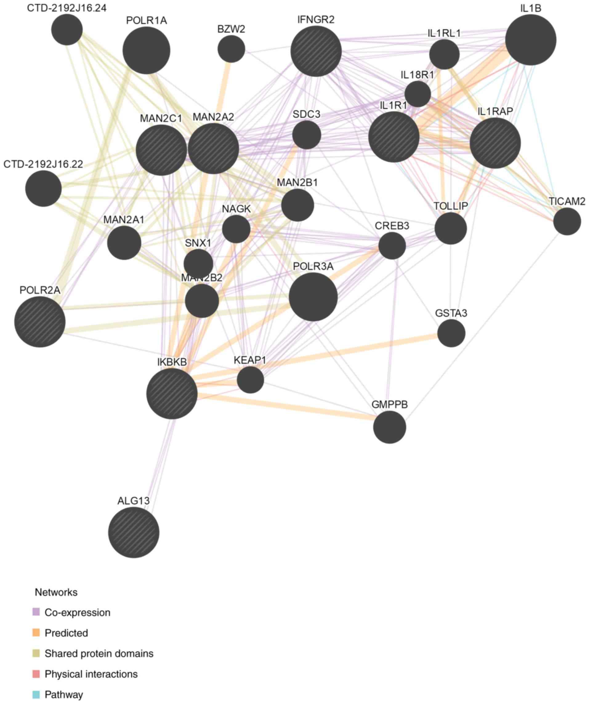 Cytokines are soluble extracellular proteins or glycoproteins that are crucial intercellular regulators and are involved in innate, as well as adaptive, inflammation of host defenses, cell growth, differentiation, cell death, angiogenesis, development and repair processes (40). Cytokines and cytokine receptor interaction networks are regarded as essential components of inflammation (41). In the current RNA sequencing studies, 12 DEGs were enriched in cytokine-cytokine receptor interactions. These DEGs included BMPR1B, IL6ST, IFNGR2, IL1RAP, and EPOR, which have been reported to be involved in host immune response to viral infections. IL-6ST encodes membrane glycoprotein 130 (gp130). It is the common signal transducing component of the IL6 cytokine receptor family, which forms complexes with the ligand-binding receptor subunits of multiple IL6 cytokine family members, serving as an important activator of JAK-STAT signaling. IL-6ST has also been reported to be involved in the host response for the infection of influenza virus (42,43). These results suggested that eleutheroside B1 may inhibit influenza virus through cytokine and cytokine receptor interaction networks, although more evidence is required to conclusively demonstrate this finding.