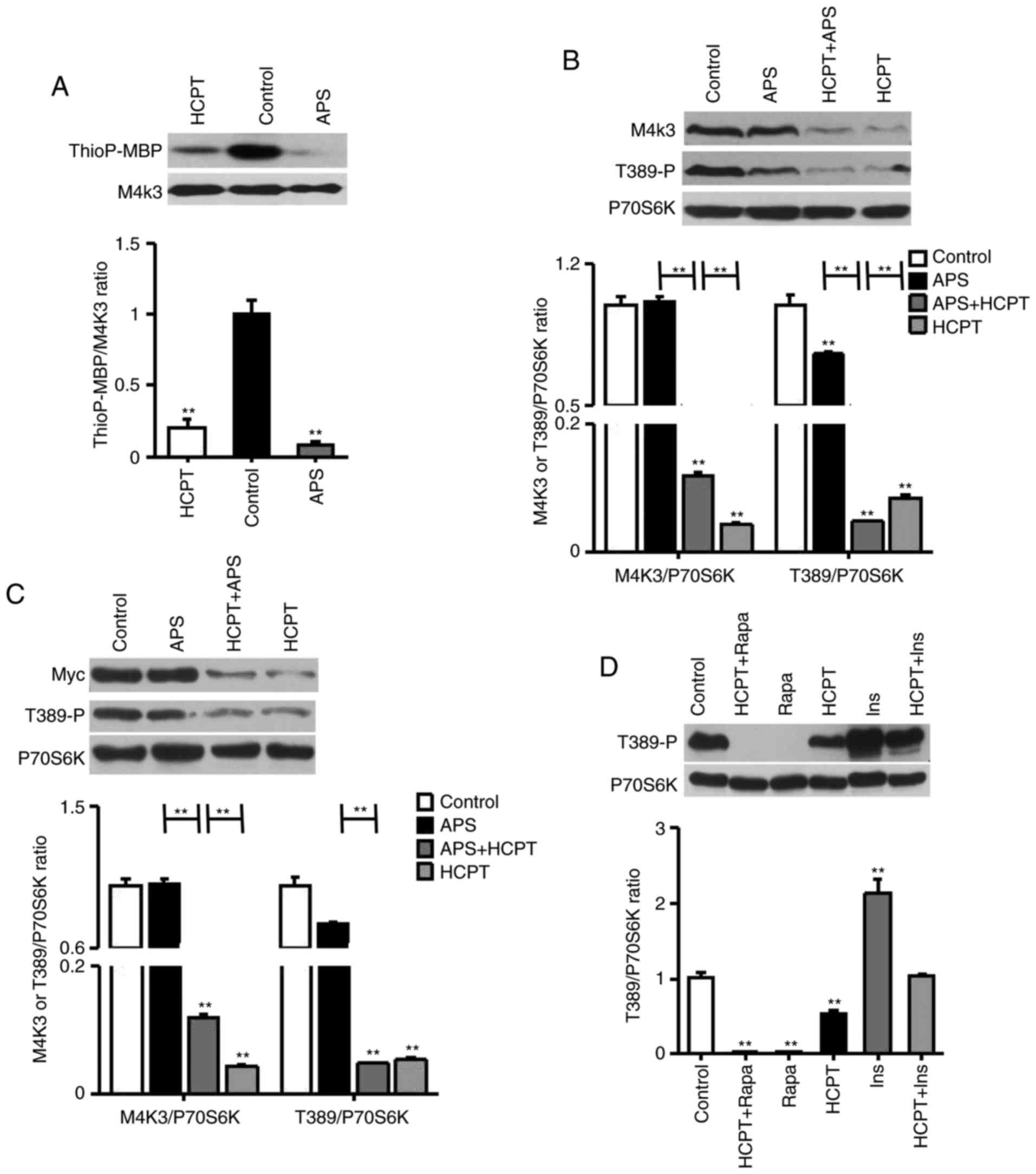 Subsequently, it was demonstrated that APS and HCPT inhibited the phosphorylation of S6K. The endogenous expression of MAP4K3 in H1299 cells was markedly reduced by HCPT, although not by APS (Fig. 1B). HCPT and the combined agents inhibited S6K phosphorylation at Thr389 by 10.02±0.01 and 20.89±0.01-fold, respectively, which was increased compared with APS (1.33±0.02-fold). In addition, the overexpression of MAP4K3 reduced the inhibition of mTOR signaling in the presence of APS, although not when treated with HCPT or the combined agents (Fig. 1C). Unlike rapamycin, a specific inhibitor of mTOR, HCPT was observed to partially inhibit insulin-responsive mTOR activation (Fig. 1D). These results suggested that the two agents impaired the activation of MAP4K3 and act on the mTOR signaling pathway in a similar manner.