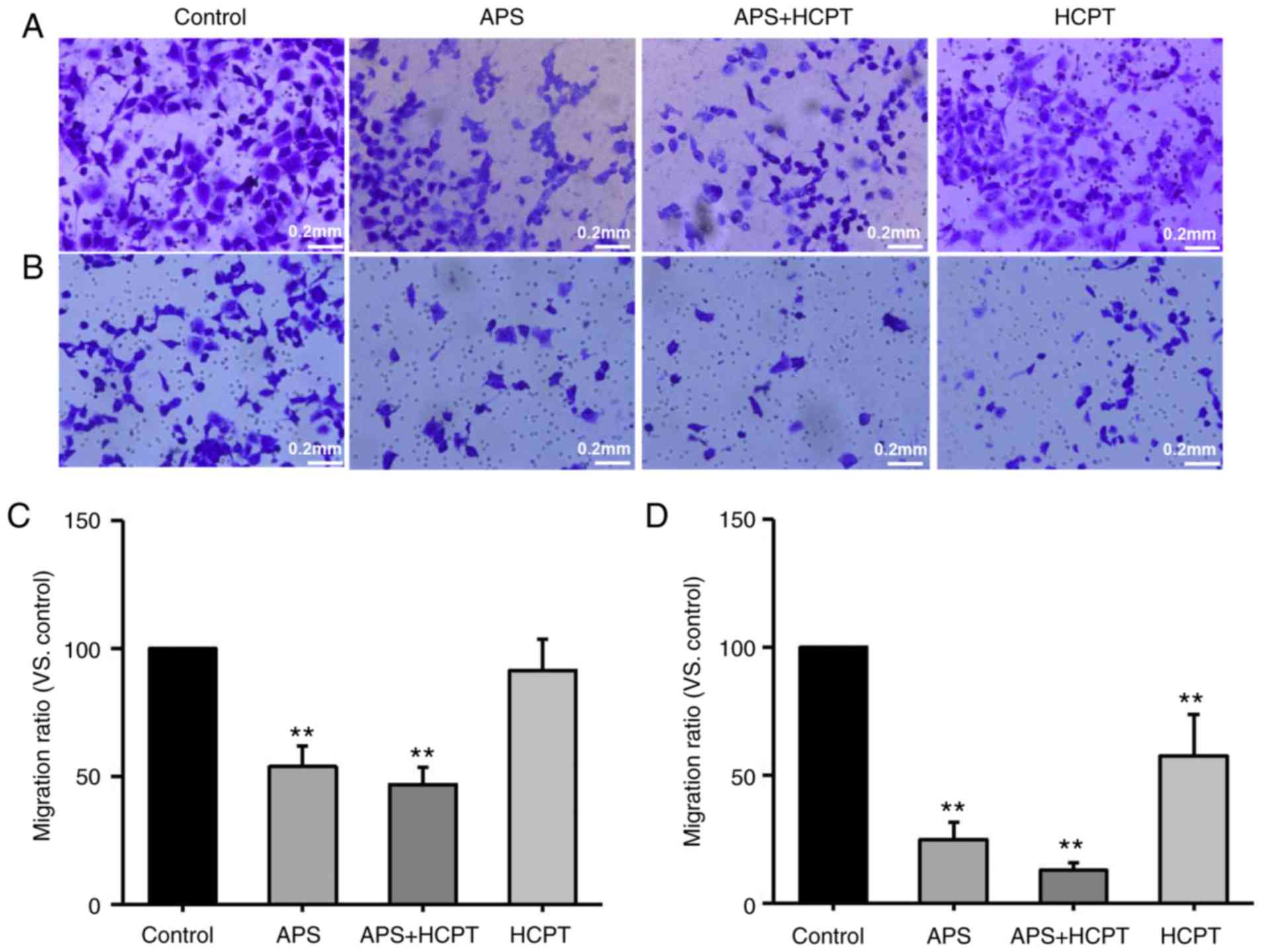 Transwell assays were also performed with polycarbonate filters to analyze the migration and invasion of H1299 (Fig. 8A-D). It was demonstrated that APS and the combination of APS and HCPT inhibited migration by 46.21±7.93 and 53.09±6.7%, respectively, whereas HCPT only had a moderate effect on migration, indicating that treatment with APS and the combined agents inhibited the migration of H1299 cells more effectively than HCPT (Fig. 8A and C). It was also observed that treatment with APS, the combined agents and HCPT inhibited the invasion of H1299 cells by 75.13±6.63, 87.22±3.01 and 42.52±16.36%, respectively, compared with the control, suggesting that the combination of the agents was more effective in inhibiting H1299 migration and invasion compared with APS treatment alone or HCPT alone (Fig. 8B and D).