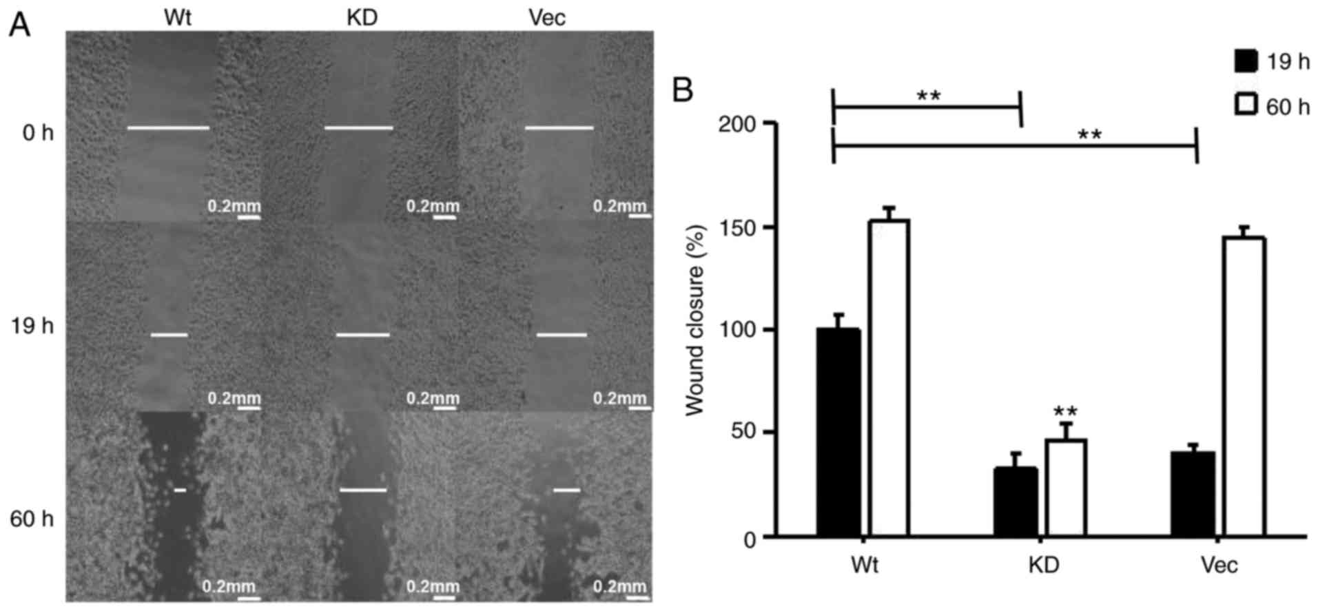 The present study considered whether the overexpression of MAP4K3 stimulates the migration of H1299 cells, despite H1299 exhibit relatively high background expression of MAP4K3. The H1299 cells were transfected with wild-type MAP4K3 and KD MAP4K3, and it was demonstrated that cells transfected with wild-type MAP4K3 led to more rapid closure of the wounded area compared with the cells transfected with KD MAP4K3 or the vector control (Fig. 9A-C). It was also observed that cells transfected with wild-type MAP4K3 and the vector control almost fully reversed the inflicted wound within a 60-h incubation period, whereas the cells transfected with the KD MAP4K3 exhibited decreased migration, suggesting that the KD MAP4K3 behaves like a dominant negative mutation. The results also suggested that, when cells transfected with wild-type MAP4K3 were exposed to APS, their invasive properties were reduced (Fig. 9D and E). The overexpression of MAP4K3 also increased wound closure in the H460 cell line (Fig. 10A and B).