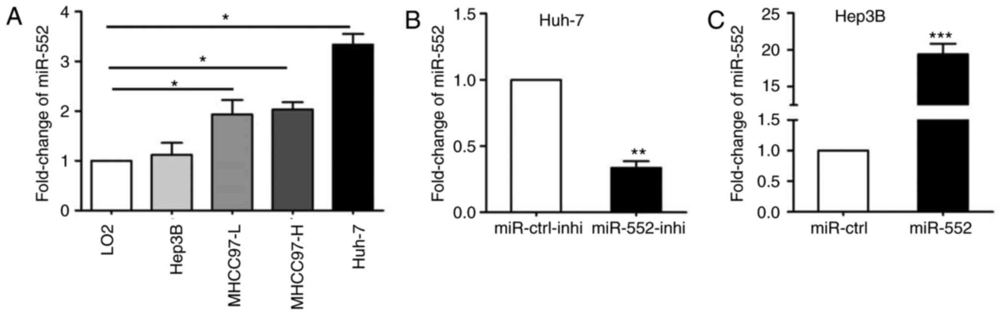 Next, qPCR was used to demonstrate that miR-552 was upregulated in all HCC cell lines with the exception of Hep3B (Fig. 2A; P<0.05). miR-552 expression was then silenced in Huh-7 cells (Fig. 2B; P<0.01) and overexpressed in Hep3B cells (Fig. 2C; P<0.001).