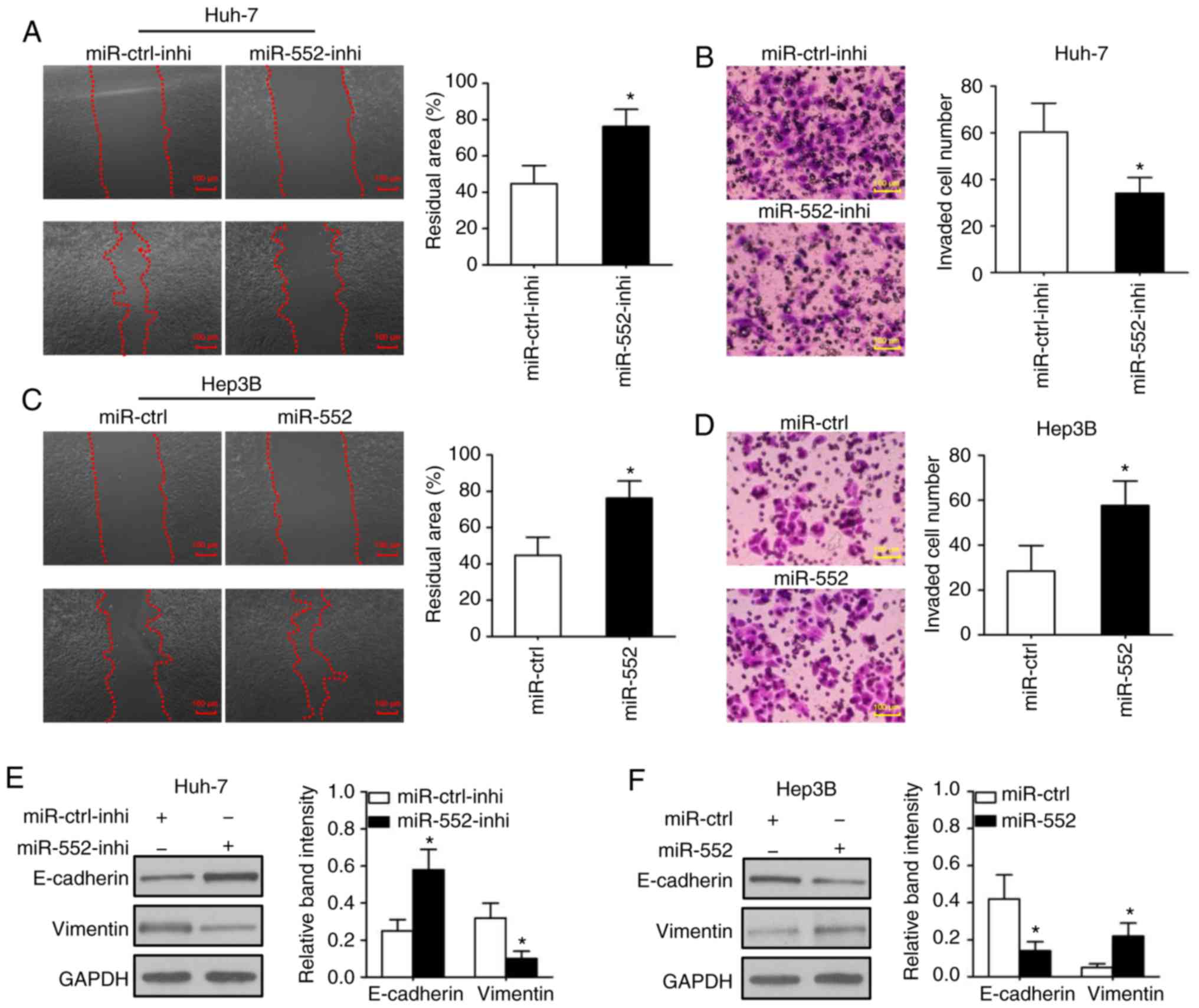 miR-552, a novel cancer-associated miRNA, has been studied primarily in colorectal cancer (CRC) (8). Functionally, miR-552 was demonstrated to increase CRC cell migration and invasion abilities (9). However, the functions of miR-552 in the metastasis of HCC and detailed mechanisms associated with epithelial-mesenchymal transition (EMT), which is an important mechanism for cell migration and invasion (10), remains unclear.
