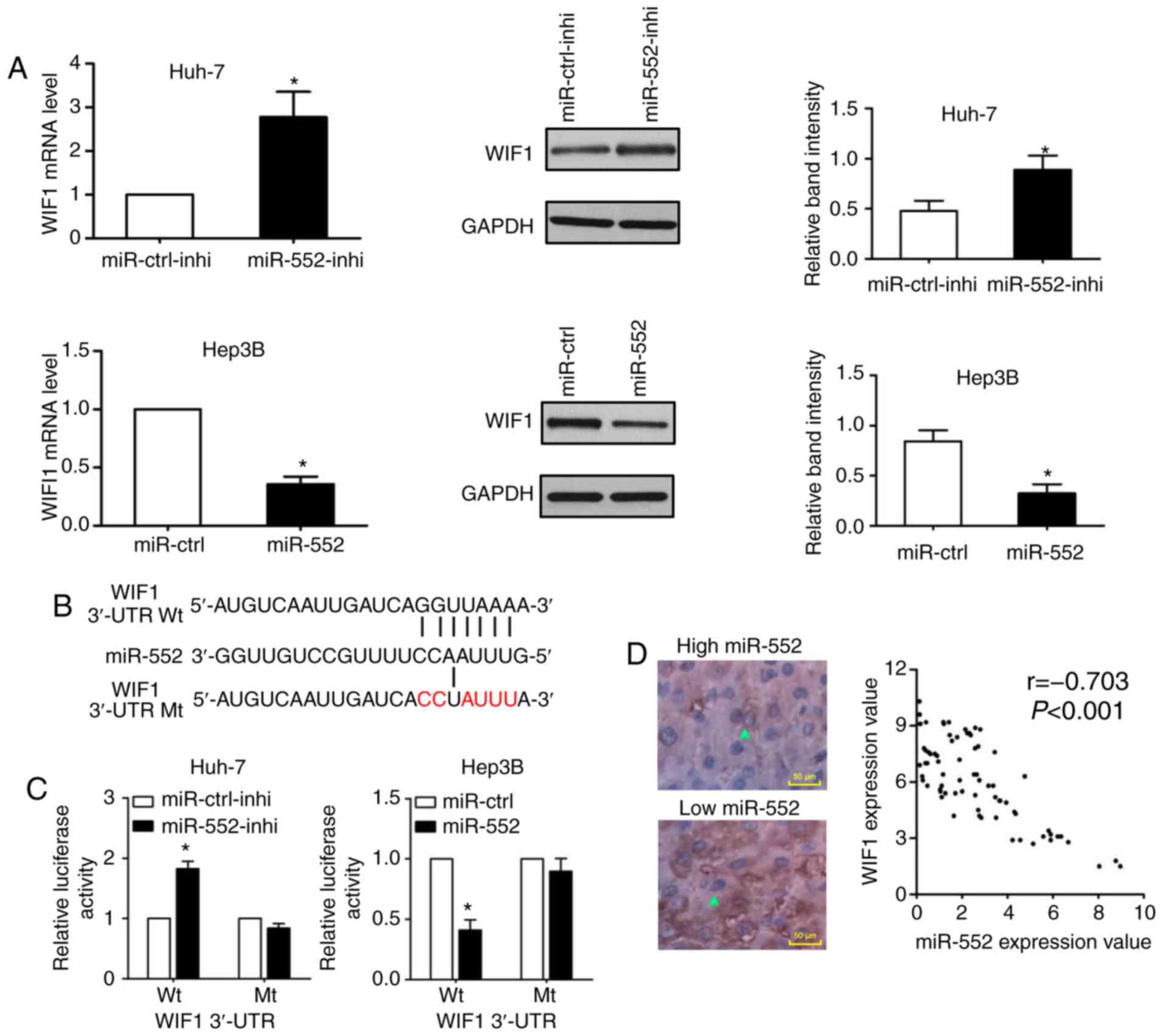 miRNAs may bind to the 3′-UTR and act as inhibitors to decrease certain mRNAs expression. A total of 2 online MicroRNA targets prediction tools, TargetScan (http://www.targetscan.org/) and MiRanda (http://www.microrna.org), were used to predict WIF1 as a downstream target of miR-552. As indicated in Fig. 4A, knockdown of miR-552 increased WIF1 mRNA and protein expression in Huh-7 cells (P<0.05); conversely, miR-552 overexpression decreased WIF1 expression in Hep3B cells (P<0.05). Additionally, the wild-type and mutant-type dual-luciferase reporters were constructed according the binding sequence between miR-552 and WIF1 3′-UTR (Fig. 4B). As demonstrated in Fig. 4C, the dual-luciferase reporter assay demonstrated that the downregulation of miR-552 increased the luciferase activity of wild-type WIF1 3′-UTR (P<0.05), whereas the upregulation of miR-552 decreased the luciferase activity of the wild-type WIF1 3′-UTR (P<0.05). In either miR-552 knockdown or induction, there was no significant change on the luciferase activity of mutant WIF1 3′-UTR. Furthermore, a negative correlation between miR-552 and WIF1 expression was confirmed by Spearman correlation analysis (Fig. 4D; r=-0.703; P<0.001). These data provided convincing evidence to suggest that WIF1 is a direct target of miR-552 in HCC.