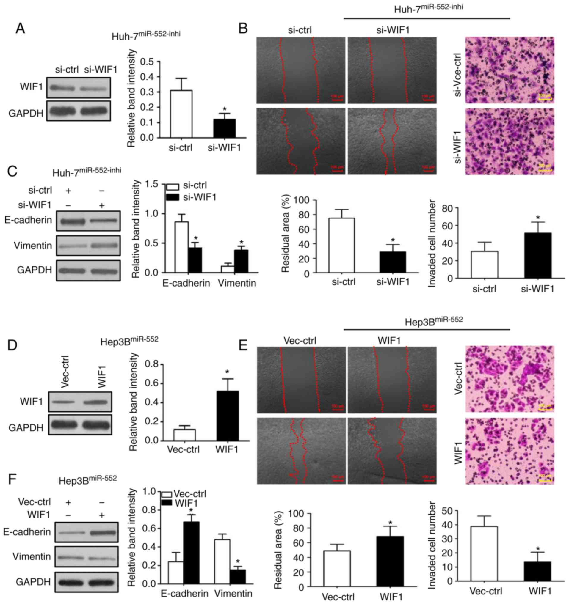 To additionally investigate the underlying mechanisms of miR-552/WIF1 axis on tumor progression, WIF1 expression was first inhibited in miR-552 downregulated Huh-7 cells (Fig. 5A; P<0.05). The wound-healing and Transwell assays were then repeated to indicate that WIF1 knockdown abrogated the inhibitory effects of migration, invasion and EMT induced by miR-552 downregulation (Fig. 5B and C; P<0.05). Subsequently, the same experiments were used to demonstrate that WIF1 overexpression decreased the migration, invasion and EMT in miR-552-upregulated Hep3B cells (Fig. 5D-F; P<0.05).
