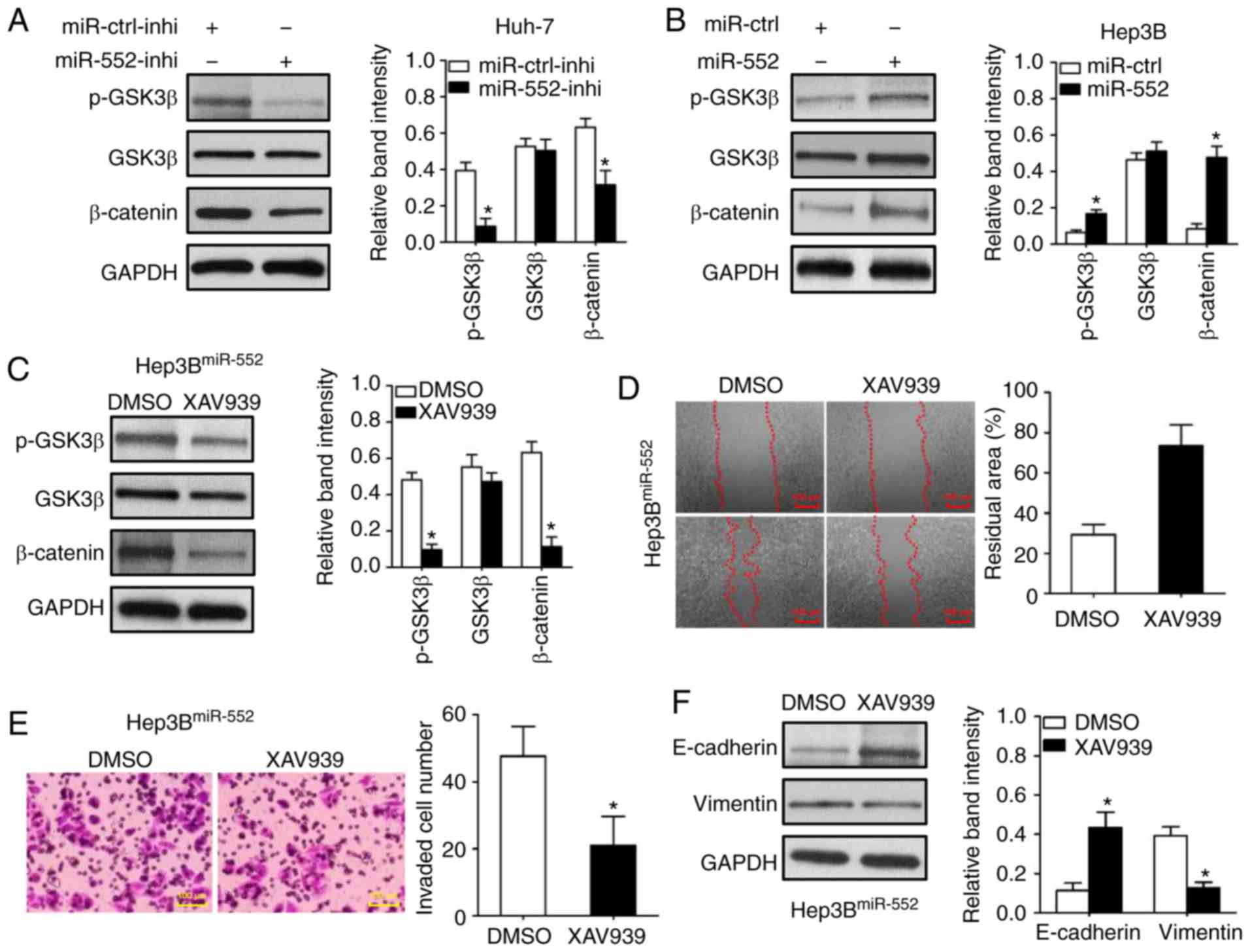 Western blot analysis was used to demonstrate that miR-552 knockdown decreased GSK3β phosphorylation at Ser9 in Huh-7 cells (Fig. 6A; P<0.05). The dephosphorylation of GSK3β inhibited β-catenin expression (Fig. 6A; P<0.05). Conversely, miR-552 overexpression increased GSK3β phosphorylation and β-catenin expression in Hep3B cells (Fig. 6B; P<0.05). Additionally, the inhibition of the GSK3β/β-catenin signaling pathway by XAV939 (Fig. 6C; P<0.05) abrogated the oncogenic functions of miR-552 overexpression on Hep3B cell migration and invasion (Fig. 6D and E; P<0.05). XAV939 treatment also inhibited miR-552-induced EMT in Hep3B cells (Fig. 6F; P<0.05). Taken together, these data demonstrate that the oncogenic functions of miR-552 in HCC cells were attributed to a decreased activation of the GSK3β/β-catenin signaling pathway, mediated by WIF1.