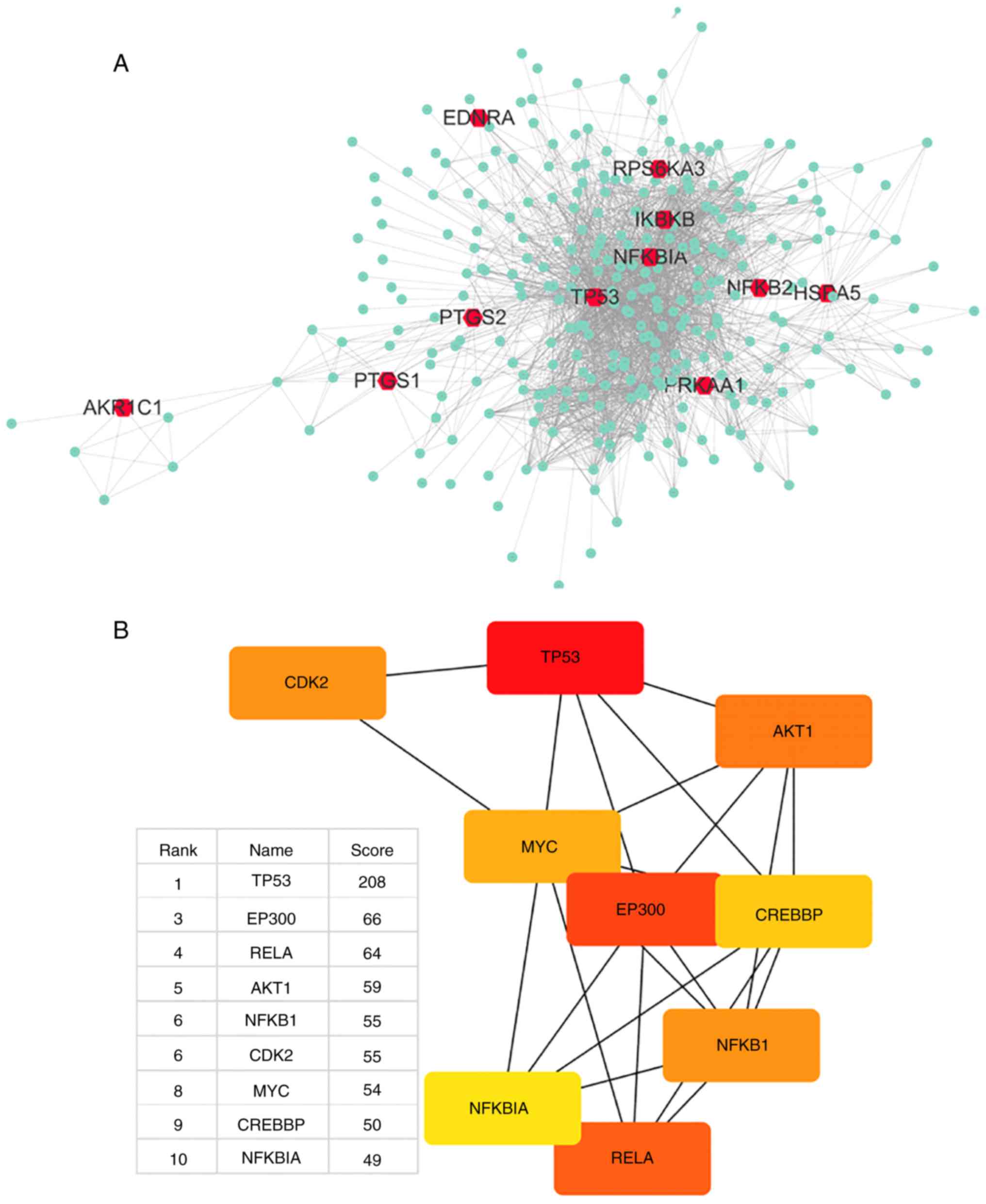 Aspirin was input to DrugBank, which output DB00945-aspirin with 11 targets. Aspirin can inhibit PTGS1, PTGS2 and AKR1C1, activate PRKAA1, acetylate TP53, bind to HSPA5, and antagonize NFKB2; the actions of EDNRA, IKBKB, RPS6KA3 and NFKBIA were not mentioned but were closely associated with aspirin. Table I presents detailed information on the 11 primary DPTs of aspirin. Using the STRING database, a total of 300 proteins were identified that were associated with aspirin and its 11 primary DPTs, and a network of aspirin target-protein interactions was created (Fig. 1A). The 11 primary DPTs and their secondary DPT-associated proteins are presented in Fig. 1A. Next, Cytohubba in Cytoscape was used to analyze the top 10 hub genes in this network by degree, and these are as follows: TP53, UBC, EP300, RELA, AKT1, NFKB1, CDK2, MYC, CREBBP and NFKBIA (Fig. 1B).