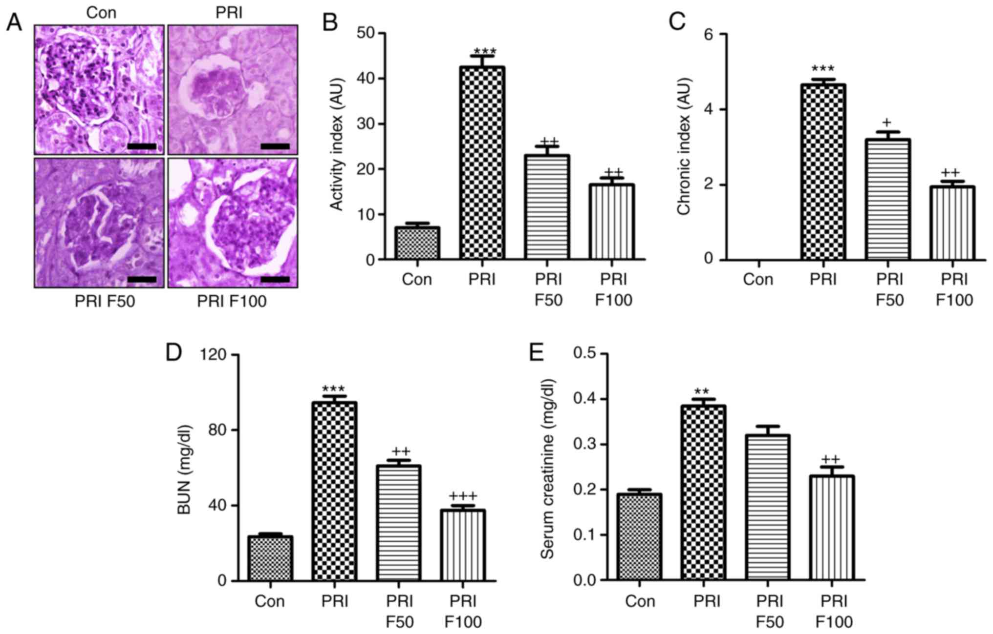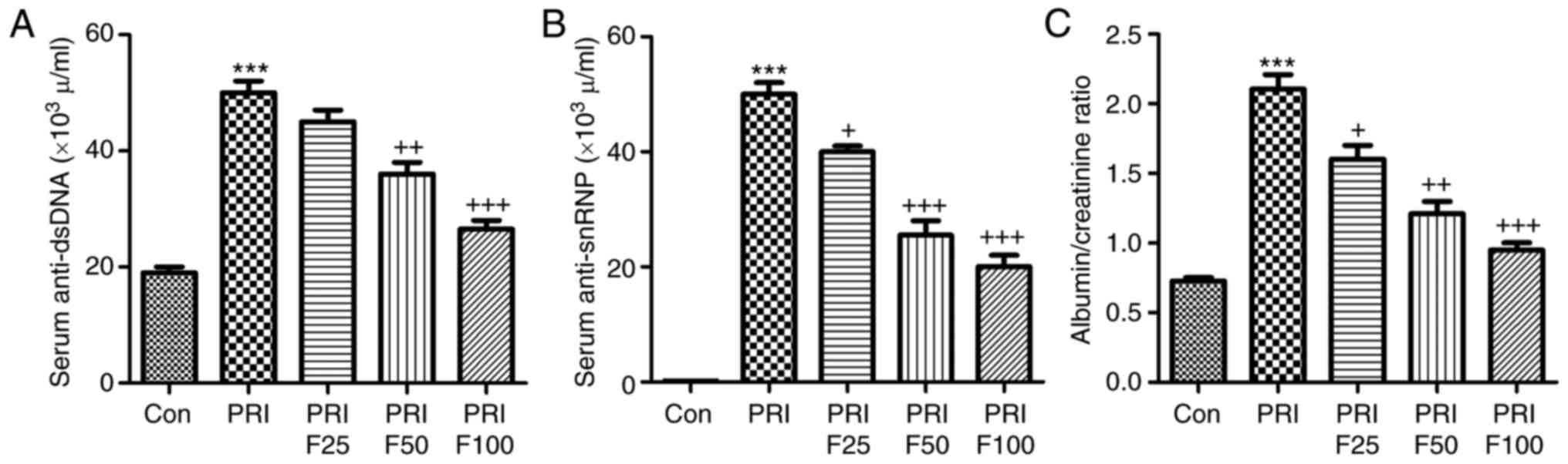 In the present study, pristane was used to induce SLE in mice, which was characterized by elevated anti-dsDNA antibodies, anti-snRNP antibodies and the ratio of albumin to creatinine, indicating renal injury in mice. The renal architecture was significantly preserved, as fisetin treatment prevented PRI-induced histological alterations, indicating that nephritis was caused in this model of lupus. Of note, fisetin administration significantly reduced the levels of these antibodies, as well as the activity and chronicity indexes determined from PAS staining analysis.