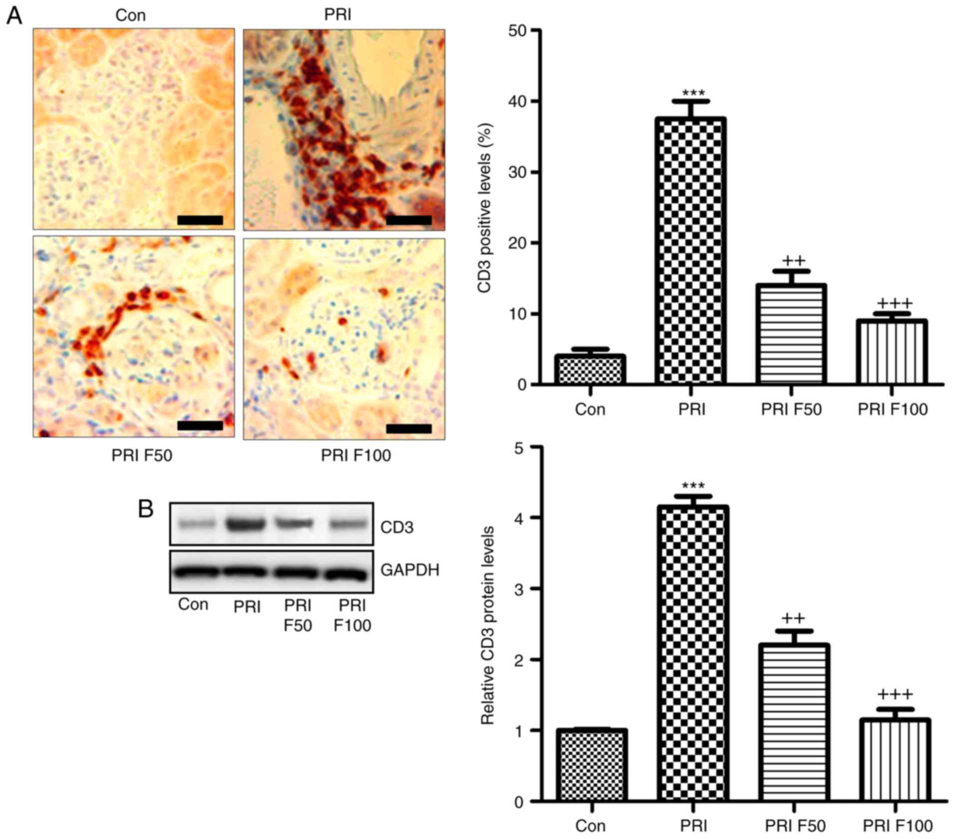 In order to determine the effect of fisetin on PRI-induced nephritis in mice, the renal sections were histologically examined by PAS staining, which was evaluated using indexes of activity and chronicity. As presented in Fig. 2A and B, the activity index was markedly enhanced by PRI induction, which was comparable to that in the control group. Fisetin administration significantly reduced the activity index, indicating that lupus nephritis was attenuated by fisetin. Consistently, the PRI-induced elevation in the chronicity index was also reduced by fisetin treatment (Fig. 2A and C). In addition, serum BUN and creatinine levels were highly induced by PRI, which was inhibited by fisetin, indicating renal injury induced by PRI and that fisetin had the capacity to attenuate nephritis (Fig. 2D and E). Furthermore, infiltration of CD3+ cells was assessed to calculate the effects of fisetin on SLE. The immunohistochemical analysis demonstrated that PRI treatment led to increases of CD3+ cells throughout the kidney tissue compared with the control group. Of note, fisetin-treated mice exhibited significantly reduced infiltration of CD3+ cells compared with that in the PRI group (Fig. 3A). Western blot analysis further indicated that PRI treatment increased CD3 levels, which was inhibited by fisetin (Fig. 3B). Taken together, the above results demonstrated similar results to those of other PRI-induced animal models of lupus, and various features associated with lupus nephritis induced by PRI administration were dose-dependently reduced by fisetin treatment.