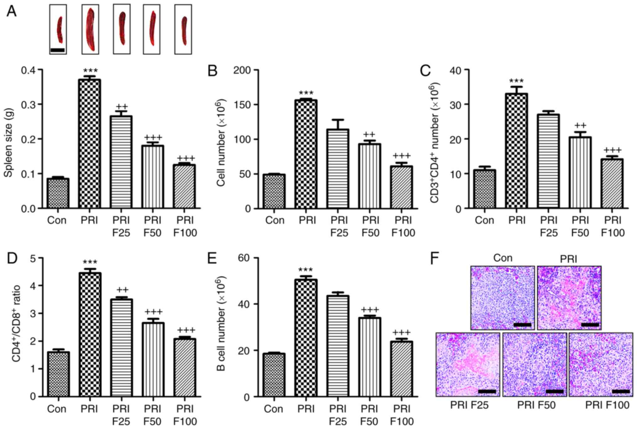 According to previous studies, splenomegaly is a characteristic of mice with SLE (27). As presented in Fig. 5A, the spleen size of mice induced with PRI was larger than that of mice without any treatment. By contrast, fisetin administration reduced the spleen size in PRI-induced mice. In addition, the total number of lymphocytes in the spleen tissue samples was markedly increased in PRI-treated mice, which was reduced by fisetin treatment (Fig. 5B). Subsequently, the composition of splenic lymphocytes was explored by flow cytometric analysis. The results presented in Fig. 5C indicated that the proportion of CD3+CD4+ T cells was highly augmented in PRI-induced mice, which was inhibited by fisetin administration. The ratio of CD4+ vs. CD8+ T cells among the total splenic lymphocytes was significantly increased in the PRI-treated mice, which was attenuated by fisetin administration (Fig. 5D). Of note, a reduced CD4+/CD8+ ratio was observed after fisetin administration compared with that in mice treated with PRI only. Furthermore, the B-cell number was also increased in the PRI-induced mice compared with that in the control group (Fig. 5E). Finally, the H&E staining indicated that PRI induced histological changes compared with control group, which was attenuated by fisetin administration (Fig. 5F). These results demonstrated that PRI treatment caused an abundance of different lymphocyte subsets in mice, which was reduced by fisetin administration, indicating its role in improving SLE induced by PRI in mice.