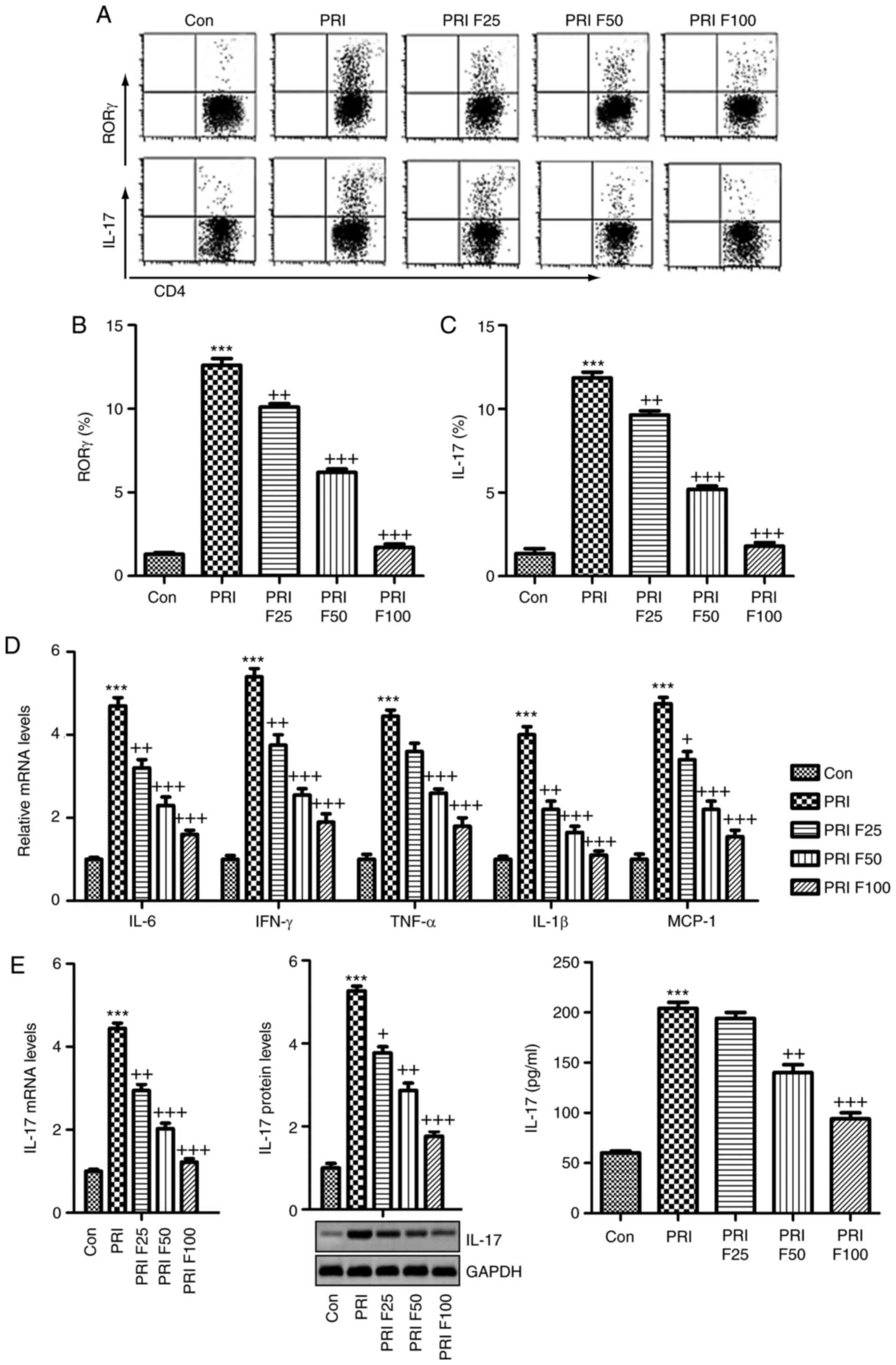 The present study attempted to evaluate the proportion of Th17 cells among the splenic CD3+CD4+ T cells through flow cytometric analysis. As presented in Fig. 6A-C, the percentage of RORγ+ cells among CD3+CD4+ T cells was significantly increased in PRI-induced mice, as well as the percentage of IL-17-generating CD3+CD4+ T cells, which were reduced by fisetin treatment in a dose-dependent manner. In addition, the pro-inflammatory cytokines in splenic cells were determined by RT-qPCR analysis. The mRNA expression of pro-inflammatory cytokines and MCP-1 was highly induced by PRI, which was in line with the circulating levels. Of note, fisetin administration markedly reduced the mRNA levels of these cytokines and MCP-1, indicating its role in suppressing the inflammatory response in mice with SLE (Fig. 6D). Finally, in order to further confirm the capacity of fisetin to ameliorate SLE induced by PRI in mice, the mRNA and protein levels of IL-17 were assessed in the splenic cells through RT-qPCR, western blotting and ELISA. As presented in Fig. 6E, PRI induced IL-17, which was inhibited by fisetin.