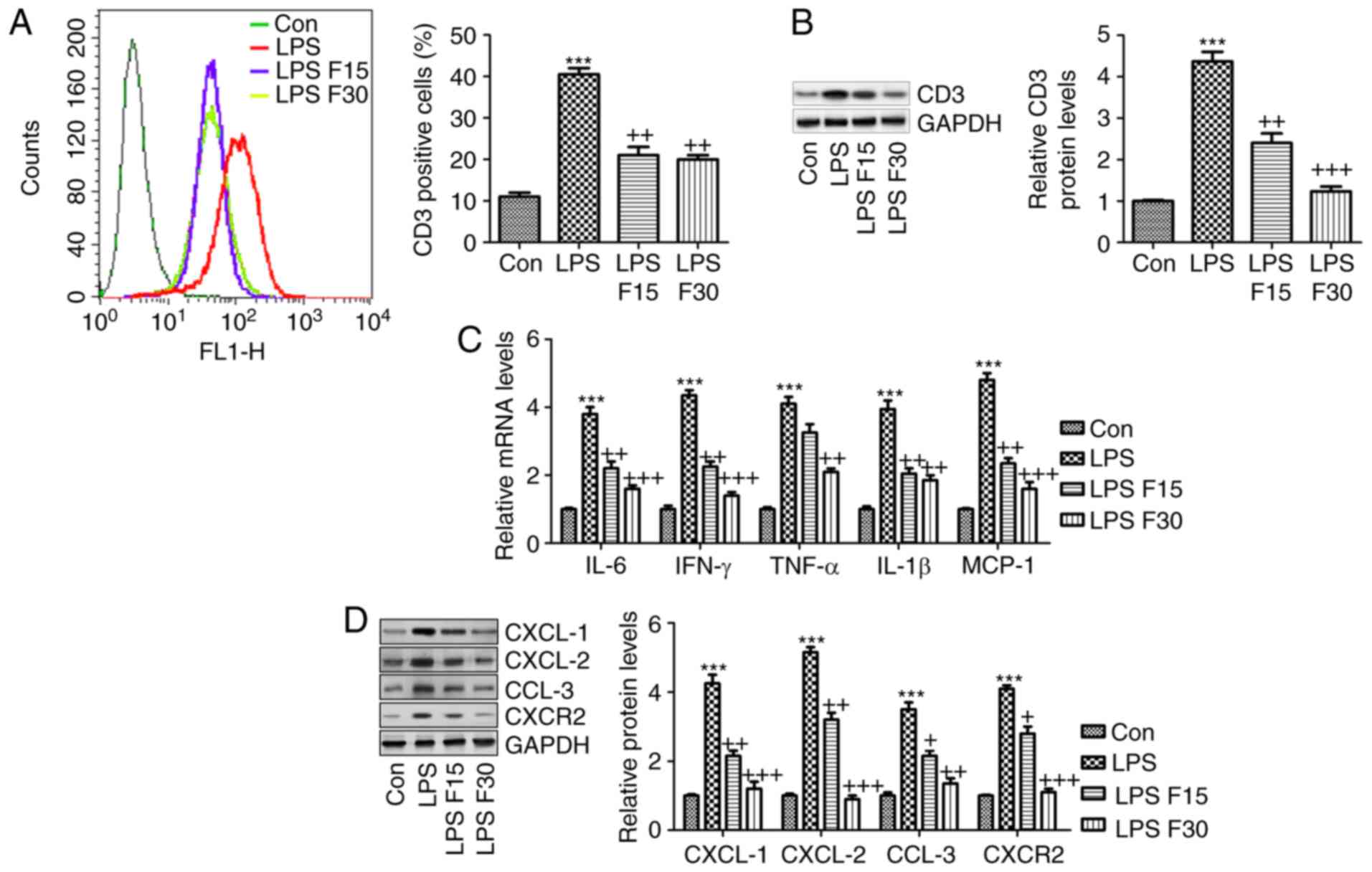 The RAW264.7 murine macrophage cell line and the 293FT cell line were purchased from the American Type Culture Collection (Manassas, VA, USA). The cells were cultured in Dulbecco's modified Eagle's medium (DMEM, Gibco; Thermo Fisher Scientific, Inc., Waltham, MA, USA) supplemented with 10% (v/v) fetal bovine serum (Gibco; Thermo Fisher Scientific, Inc.) and 1% (v/v) penicillin/streptomycin in an incubator at 37°C in a humidified atmosphere containing 5% CO2. For the experiments, cells were pre-treated with 100 ng/ml lipopolysaccharide (LPS; Sigma-Aldrich; Merck KGaA) for 2 h, followed by incubation with fisetin (15 and 30 µM) for another 24 h. Subsequently, all cells were harvested for reverse transcription-quantitative polymerase chain reaction (RT-qPCR), western blot and flow cytometric analysis.