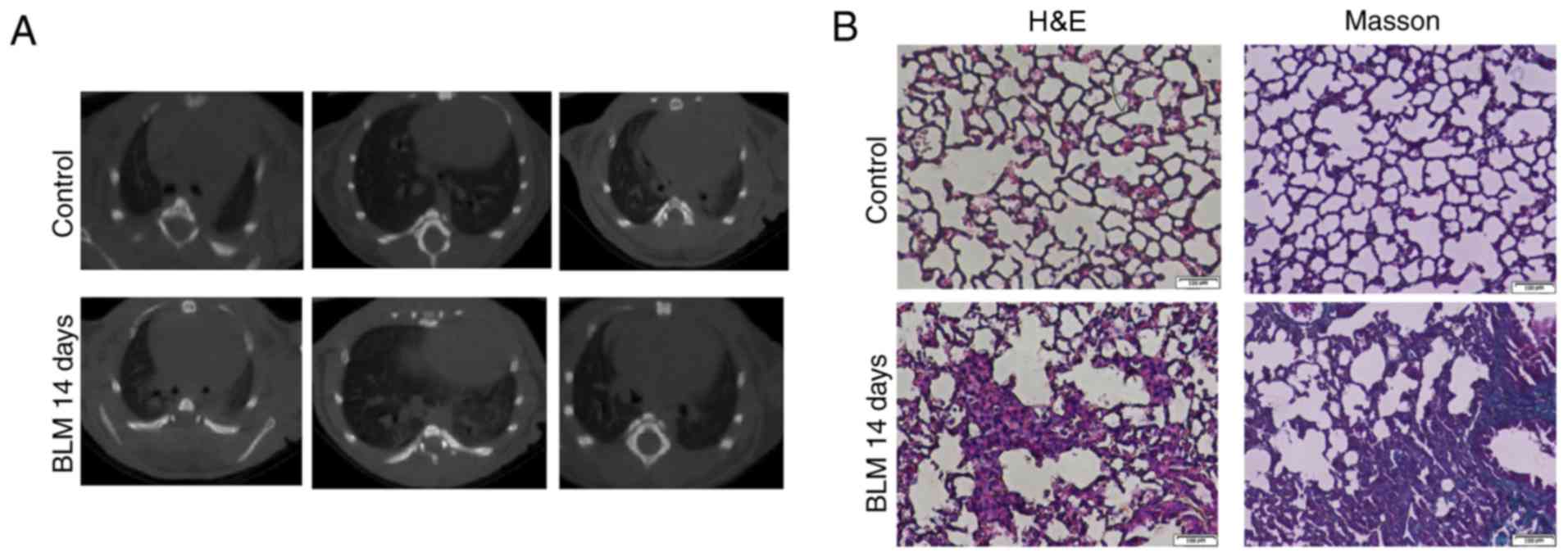 To verify the BLM-induced model of pulmonary fibrosis in mice, a pulmonary CT scan and histopathological analysis were performed. The pulmonary CT scan revealed that the lung markings of the mice in the control group were regular, with no significant abnormality in the pulmonary parenchyma. However, the Ct manifestations in BLM at 14 days were as follows: Increased bronchovascular shadows; patch lesions; diffuse dot-like patchy shadows; inhomogeneous high-density areas; blurred margins; and involvement of both lungs primarily in the lower field of the lungs (Fig. 1A). H&E staining demonstrated complete alveolar structure, normal alveolar septum as well as no evident inflammatory infiltration in lungs from mice of control group (Fig. 1B). In the BLM model, the alveolar septum was widened, the alveolar wall was collapsed or disappeared, and interstitial infiltration was evident with a large number of inflammatory cells. In addition, Masson's trichrome staining revealed that the density of collagen fibers in the alveolar epithelium and bronchial area was markedly increased in the BLM group compared with the control group (Fig. 1B). Histological analysis revealed BLM-induced architecture destruction and collagen deposition in lungs from mice, suggesting that the mice model of pulmonary fibrosis was constructed successfully.