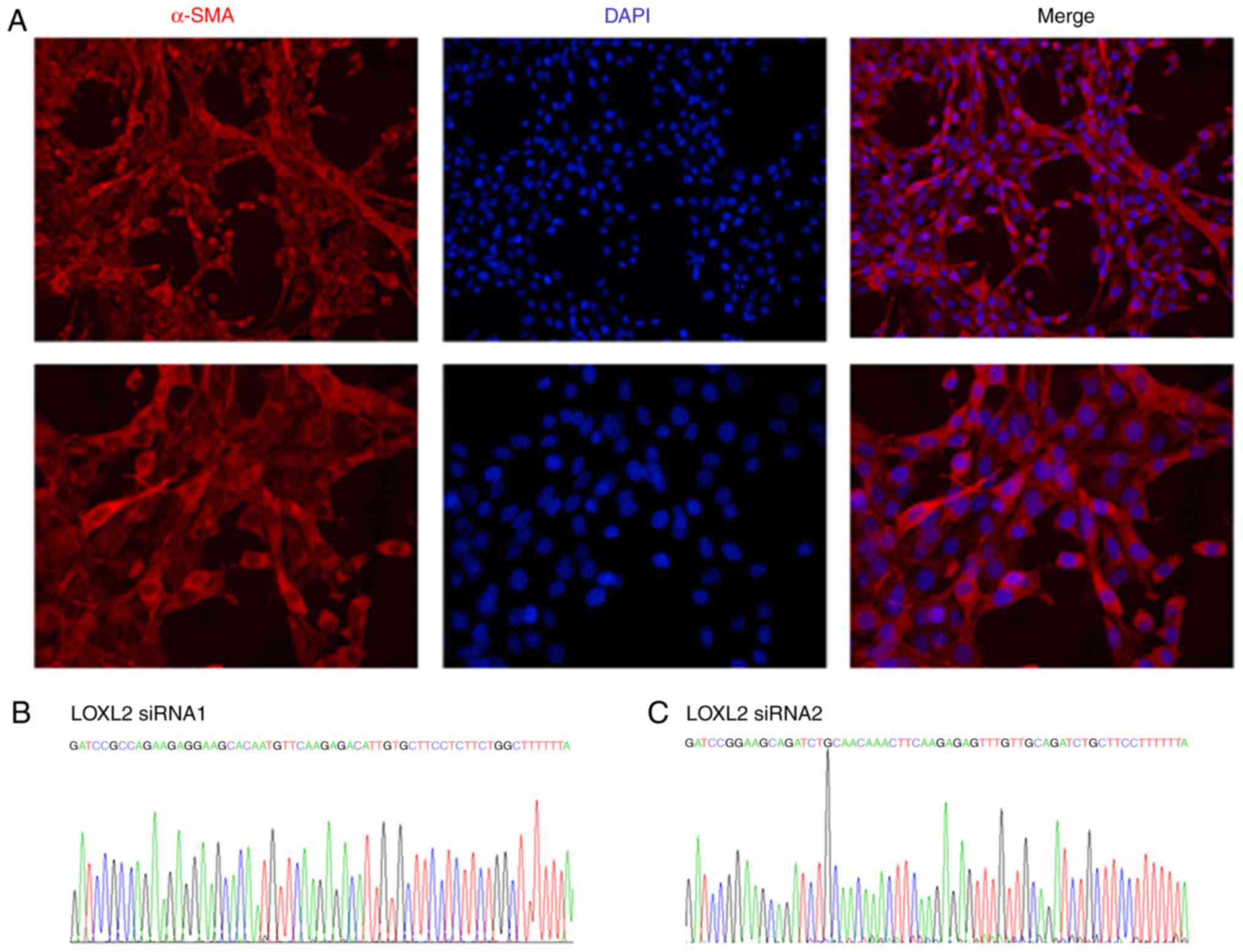 The present study was approved by the Experimental Animal Welfare Committee of Capital Medical University (Beijing, China; approval no. AEEI-2016-005). Two siRNAs and one scramble siRNA (negative control) were designed for cDNA sequence of LOXL2 gene (serial no. NM_033325.2), as shown in Table I.