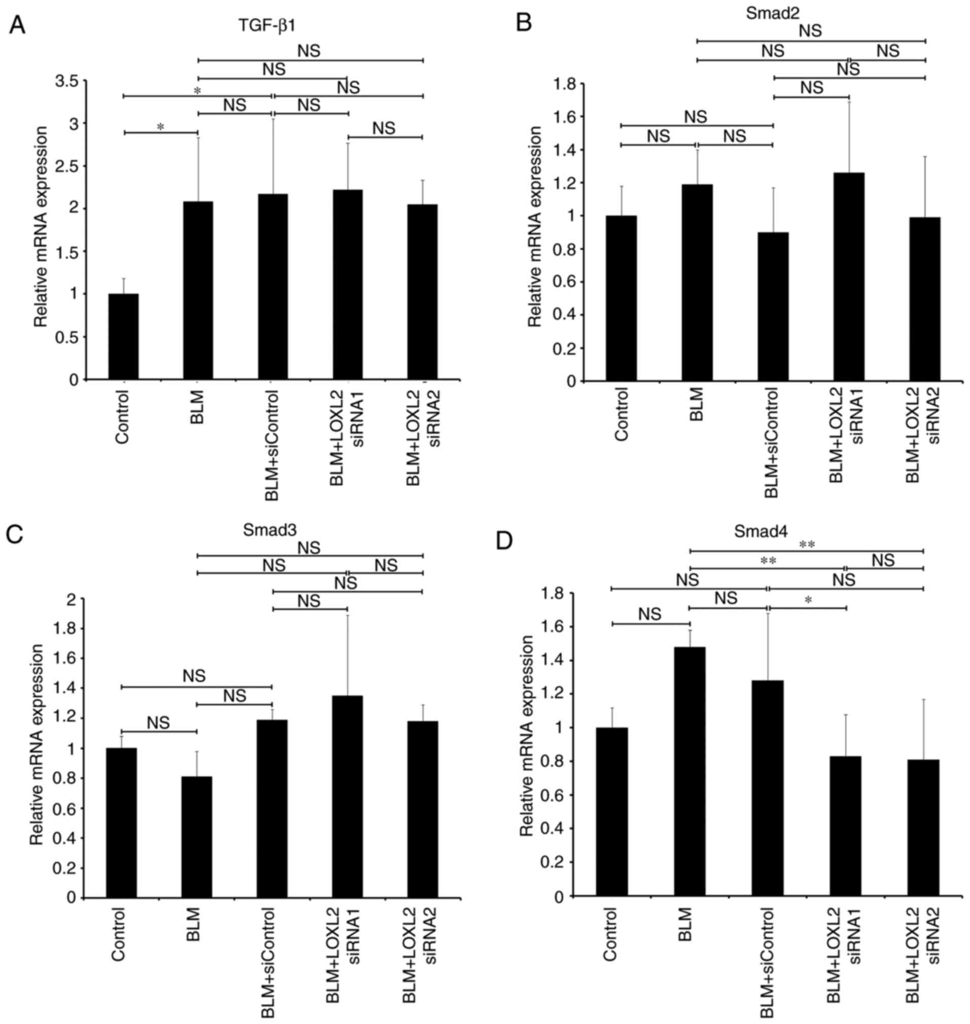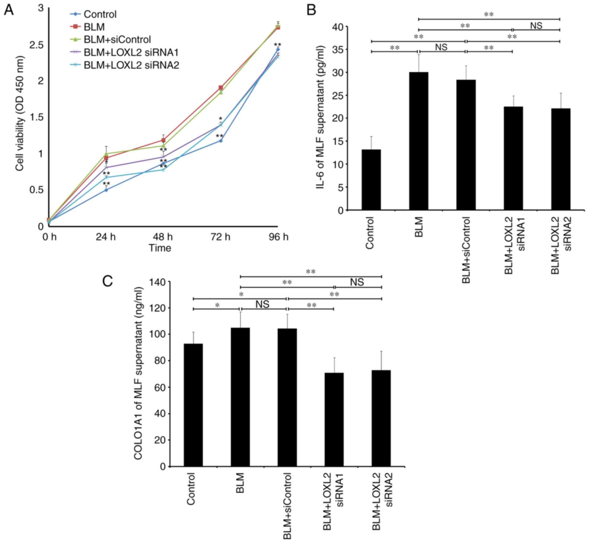 Therefore, mice models with BLM-induced pulmonary fibrosis were used in the present study, and the expression of LOXL2 in serum, lung homogenate and pulmonary tissues was observed. Then, the pulmonary tissues of mice were extracted to culture primary MLFs, and the cells were transfected using LOXL2 short interfering RNA (siRNA). The effects of LOXL2 silencing on the proliferative ability, and the expression of inflammatory factors interleukin (IL)-6 and extracellular matrix type 1 collagen α1 (COL1A1) involved in fibrosis progression were determined in vitro. In addition, the effects of LOXL2 siRNA on the expression of key factors in the TGF-β1 signaling pathway were also noted. Further investigations were performed to examine the effect of LOXL2 on the occurrence of pulmonary fibrosis and its regulatory mechanism in the TGF-β/Smad signaling pathway, providing experimental evidence for the identification of potential therapeutic targets of pulmonary fibrosis.