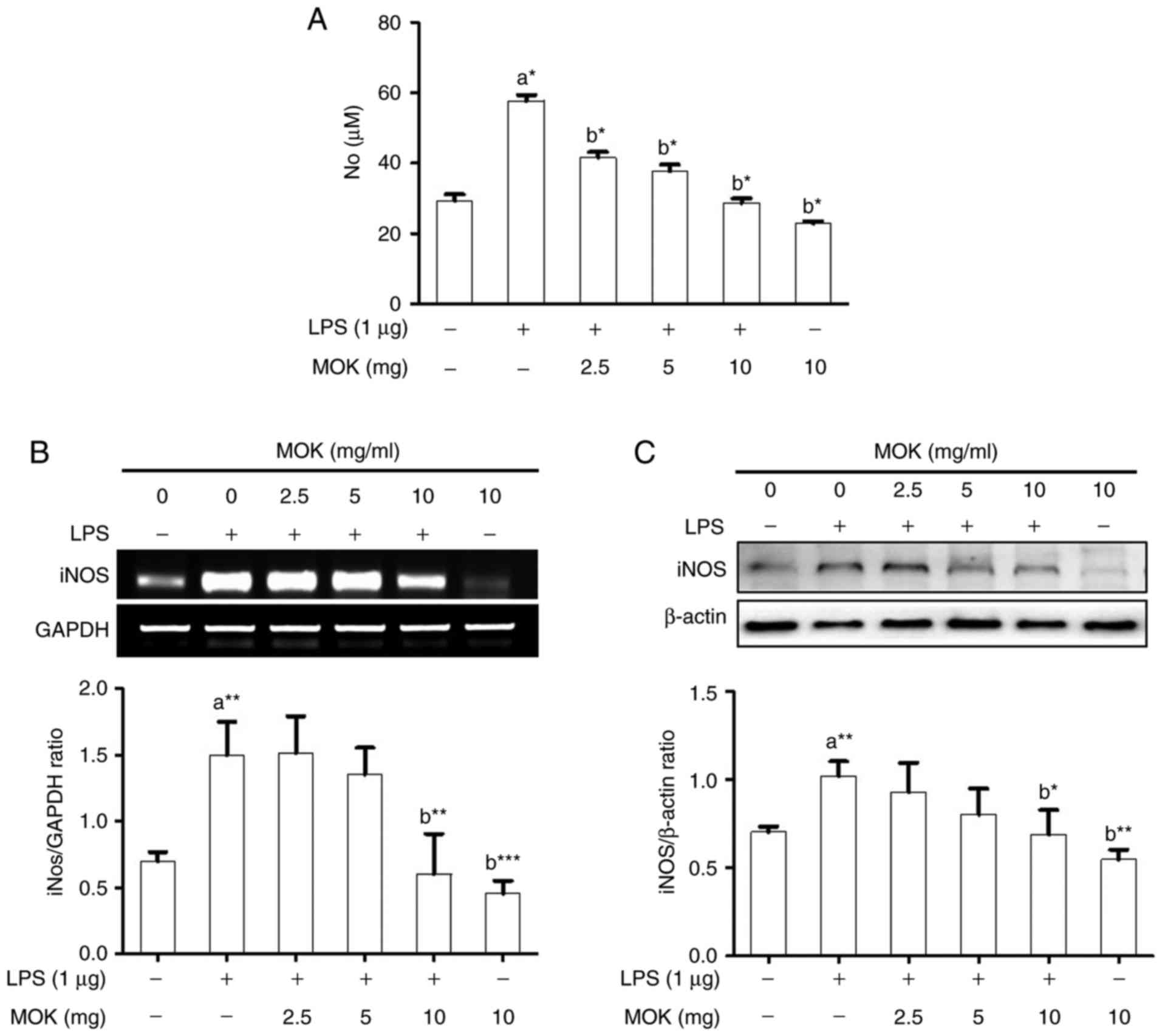Although inflammatory mediators (NO, iNOS, PGE2 and COX-2) and pro-inflammatory cytokines (TNF-α, IL-1β and IL-6) produced by activated macrophages have important functions regarding host survival and tissue repair in the normal state (36), whereas their overproduction contributes to the induction and progression of several inflammatory diseases (37,38). Accordingly, the regulation of inflammatory mediators is recognized as a beneficial therapeutic strategy for inflammatory diseases. The present study demonstrated that MOK extract inhibited NO and PGE2 production by downregulating the expression of their synthetic enzymes, including iNOS and COX-2, as well as pro-inflammatory cytokines, including IL-6, IL-1β and TNF-α, in RAW 264.7 cells stimulated by LPS. We previously reported that MOK extract also inhibits the expression of iNOS, COX-2 and pro-inflammatory cytokines in primary macrophages isolated from the mouse peritoneal cavity (18). These results indicate that MOK extract effectively improves inflammatory conditions, as it can suppress the overproduction of inflammatory mediators by activated macrophages.