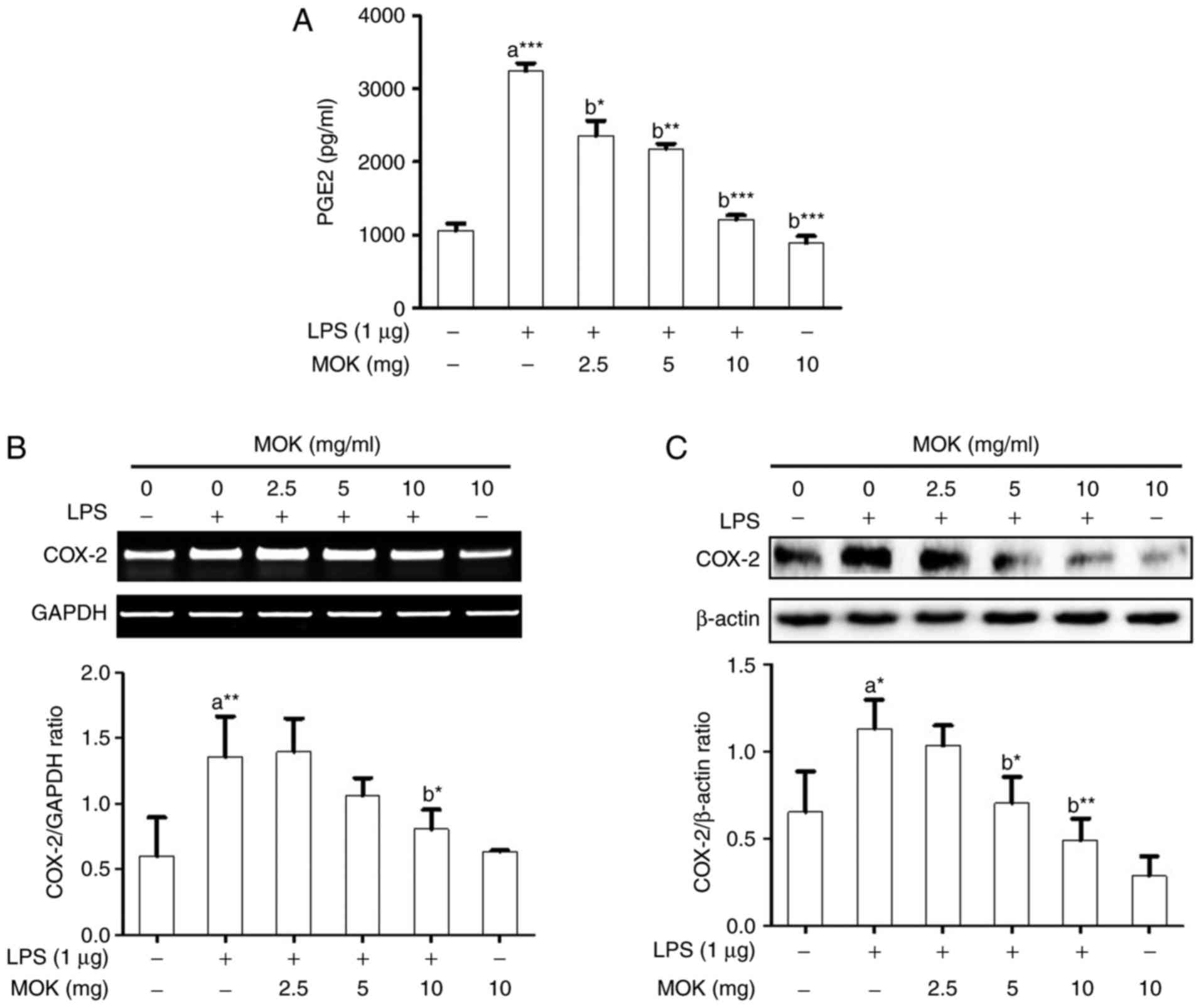 RAW 264.7 cells were pretreated with various concentrations of MOK extract for 30 min followed by stimulation with or without LPS for 18 h at 37°C in an incubator with 5% CO2. PGE2 levels were assessed by a commercially available PGE2 enzyme immunoassay kit (Cayman Chemical Co., Ann Arbor, MI, USA) in accordance with the instructions of the manufacturer. The PGE2 concentration was analyzed in accordance with the formula obtained from the standard curve generated using the PGE2 standard solution provided in the kit.