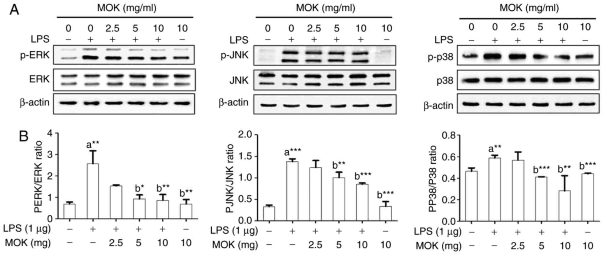 In conclusion, MOK extract, a pharmacopuncture medicine, inhibited the production of the inflammatory mediators NO and PGE2 in RAW 264.7 cells stimulated by LPS by downregulating their synthetic enzymes, iNOS and COX. The expression of pro-inflammatory cytokines, such as IL-6, IL-1β and TNF-α, was also inhibited. In addition, MOK extract inhibited the phosphorylation of ERK1/2, JNK and p38 MAPKs and the nuclear translocation of NF-κB p65 in RAW 264.7 cells stimulated by LPS. Moreover, MOK extract decreased ROS production by inducing the expression of the antioxidant enzymes MnSOD and CAT in RAW 264.7 cells stimulated by LPS. These results indicate that MOK exerts anti-inflammatory and antioxidant effects in activated macrophages, and it may be useful for the treatment of inflammatory conditions as a pharmacopuncture medicine.