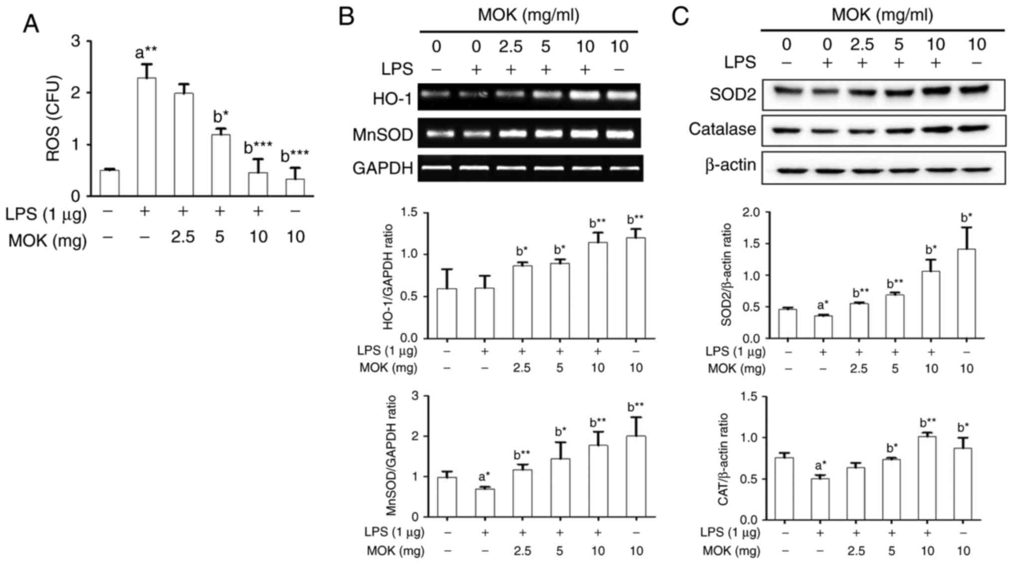 Next, the inhibitory effect of MOK extract on oxidative damage was investigated by measuring ROS production and antioxidant enzyme expression in RAW 264.7 cells stimulated by LPS. Following stimulation of the cells by LPS, ROS production exhibited a significant increase (Fig. 7A), along with a signifi-cant decrease in antioxidant enzyme expression, except HO-1 production (Fig. 7B and C). Treatment by 5 or 10 mg/ml MOK extract achieved a statistically significant decrease (P<0.05 and P<0.001, respectively) in the production of ROS in LPS-stimulated cells in a concentration-dependent manner (Fig. 7A). Additionally, with concentrations of MOK extract of 2.5, 5 and 10 mg/ml, there was a statistically significant increase in the mRNA expression of HO-1 (P<0.05, P<0.05 and P<0.01, respectively) and MnSOD (P<0.01, P<0.05 and P<0.01, respectively), as well as an increase in the expression of SOD2 (P<0.01, P<0.01 and P<0.05, respectively) and CAT (P<0.05 for 5 mg/ml and P<0.01 for 10 mg/ml) proteins in RAW 264.7 cells stimulated by LPS (Fig. 7B and C). These results indicate that MOK extract may prevent oxidative damage by inhibiting ROS production and activating antioxidant enzymes in activated macrophages.