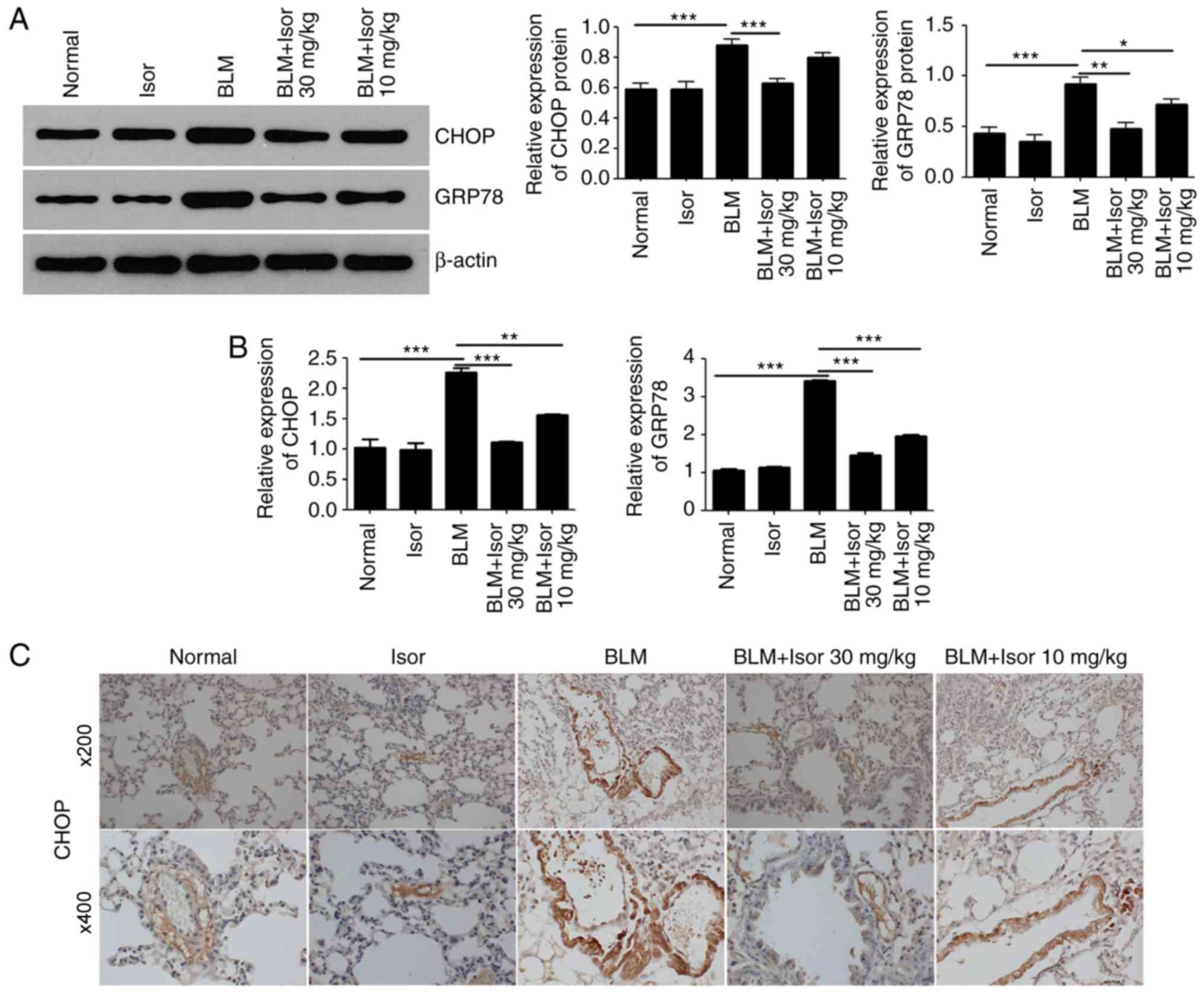 Recent studies have demonstrated that pulmonary ERS is involved in the pathogenesis of BLM-induced pulmonary fibrosis (14-16). Therefore, the effects of Isor on BLM-induced pulmonary stress were analyzed. The protein expression levels of GRP78 and CHOP were examined, as both proteins are widely used as markers for ERS. As illustrated in Fig. 2A and B, the expression of GRP78 and CHOP was upregulated in the BLM-treated mice compared with the control mice, at both the protein and mRNA level. Isor treatment significantly attenuated the BLM-induced increase in GRP78 and CHOP expression, at both the transcriptional and translational level (Fig. 2A and B). These findings suggested that Isor treatment inhibited ERS, which was in accordance with a previous study (28). Immunohistochemistry staining for CHOP was performed in lung tissues for further confirmation. CHOP expression was decreased in Isor-treated BLM-induced lung tissues (10 and 30 mg/kg) compared with BLM-induced lung tissues (Fig. 2C).