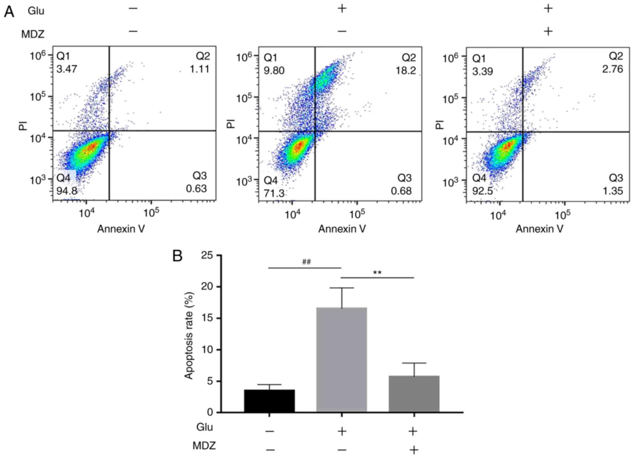 Neurons were seeded as previously described and incubated with 0.7 mM MDZ and GLU (final concentration, 100 µM). In group 2, only GLU was added (final concentration, 100 µM), while the control group lacked any treatment. The medium was removed, neurons were washed with PBS and EGTA-free trypsin was added. When neurons were detached, PBS was added, and neurons were collected in a 15 ml tube and centrifuged at 1,000 x g for 3 min at room temperature. Next, neurons were washed with PBS and centrifuged at 1,000 x g for 3 min at room temperature. Annexin-V from a Fluorescein Isothiocyanate-Annexin V Apoptosis Detection kit (BD Biosciences, San Jose, CA, USA) was used according to the manufacturer’s protocol and apoptosis was measured by MoFlo Astrios EQ flow cytometry and corresponding Summit version 6.2 software was used to analyze the results (Beckman Coulter, Brea, CA, USA) (26,27).