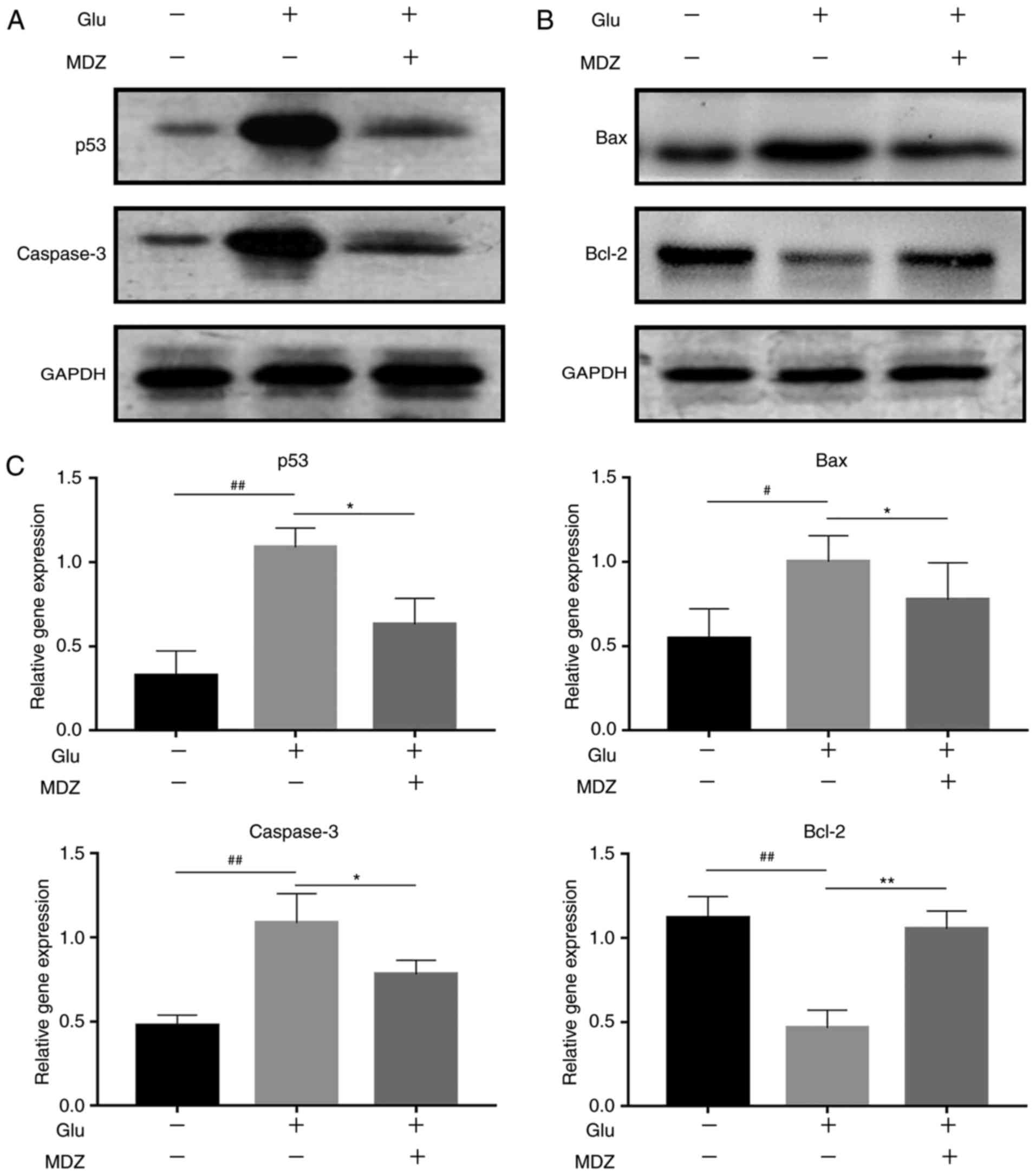 Next, the anti-apoptotic mechanism of MDZ treatment was investigated. p53 and caspase3 protein expression were noticeably increased following GLU treatment, which may increase cell apoptosis, and the expression of these proteins was significantly inhibited following MDZ treatment (Fig. 3A). Furthermore, BCL-2 gene expression was inhibited, and the expression of the apoptosis promoter gene Bax was increased following GLU treatment. MDZ also inhibited this effect (Fig. 3B). The PCR results confirmed the western blotting results, and the difference in the expression of apoptosis-associated genes between experimental groups was statistically significant (P<0.05; Fig. 3C). Therefore, GLU induced the expression of p53, caspase-3 and Bax, and inhibited Bcl-2 expression, while MDZ treatment reversed these effects.
