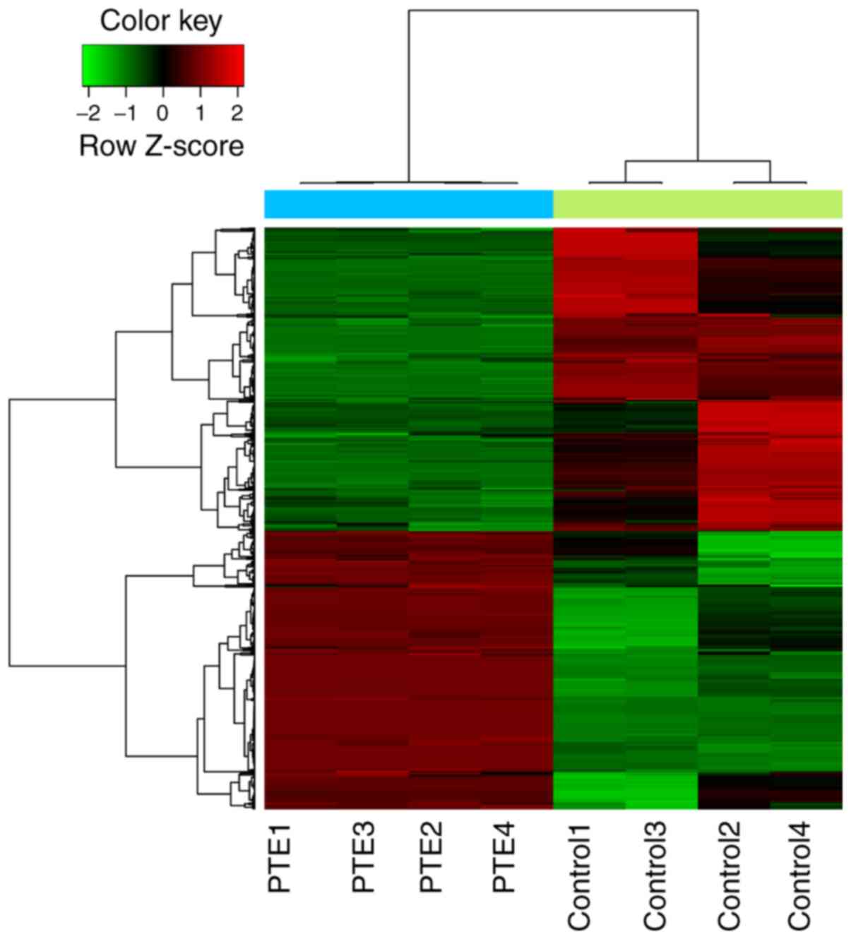 A total of 548 (262 upregulated and 286 downregulated DEGs) were identified in the PTE group, compared with the control group. The results of the hierarchical clustering heat map of DEGs showed that these DEGs were clearly distinguishable between the different sample types (Fig. 1).