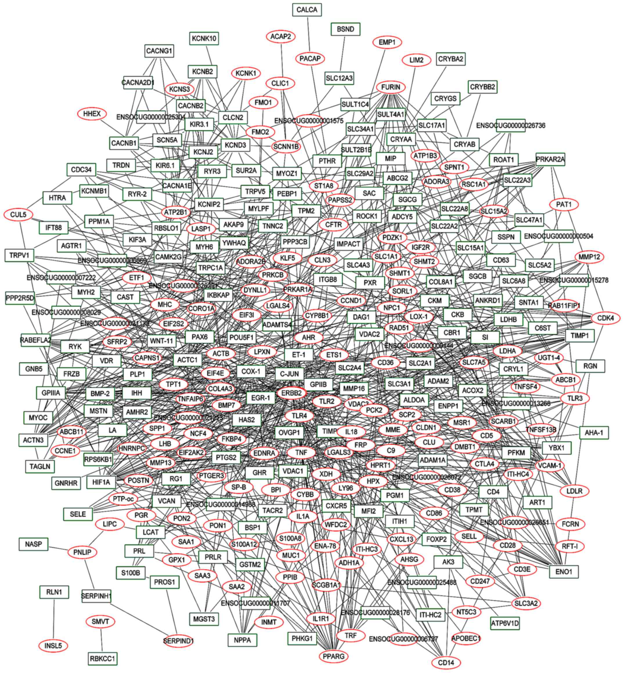 The PPIs of the DEGs between the control group and PTE group were extracted from the Search Tool for the Retrieval of Interacting Genes/Proteins database (version 10.0, http://www.string‑db.org/) with default parameters (species: Oryctolagus cuniculus) (17). Those PPIs meeting the combined score requirement of >0.4 were used to construct the PPI network, which was then visualized using Cytoscape (version 3.2.0, http://cytoscape.org/) (18). In the PPI network, each node represents a protein, and each edge between two nodes represents an interaction between these two proteins. The degree is defined as the number of proteins interacting with the node.