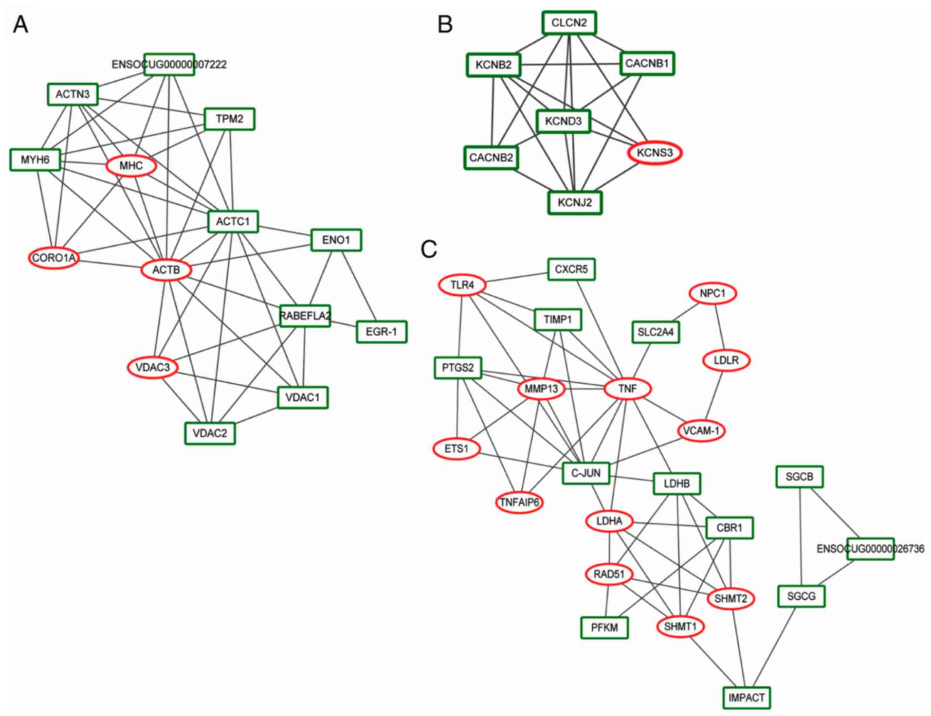 In total, three subnet modules (A‑C) were identified with a score >4. Module A (score=6.769) included 14 nodes (e.g. actin β) and 44 interactional pairs (Fig. 4A). Module B (score=6) had seven nodes (e.g. potassium voltage-gated channel subfamily B member 2) and 18 interactional pairs (Fig. 4B). Module C (score=4.435) included 24 nodes (e.g. TNF and C‑JUN) and 51 interactional pairs (Fig. 4C). Genes in module A were most enriched in cardiac muscle contraction (P=3.97E-03), hypertrophic cardiomyopathy (P=4.79E-03) and dilated cardiomyopathy (P=5.45E-03). Genes in module B were most enriched in the oxytocin signaling pathway (P=1.33E‑03), whereas biosynthesis of antibiotics in the KEGG pathways (P=1.61E‑03) was enriched in module C genes.