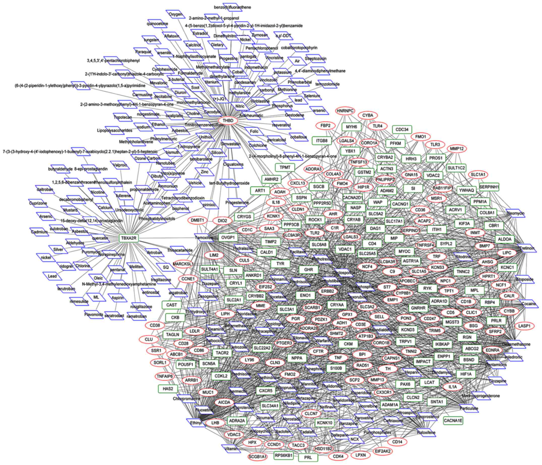 The CTD, a publicly available database (http://ctdbase.org/), provides manually curated information on chemical-disease, gene-disease associations and chemical‑gene/protein interactions. Based on PE‑related chemical-gene interaction data provided by the CTD (22), the chemical‑gene interaction association pairs were visualized via Cytoscape. Chemicals interacting with a higher number of DEGs may be more important in this disease.